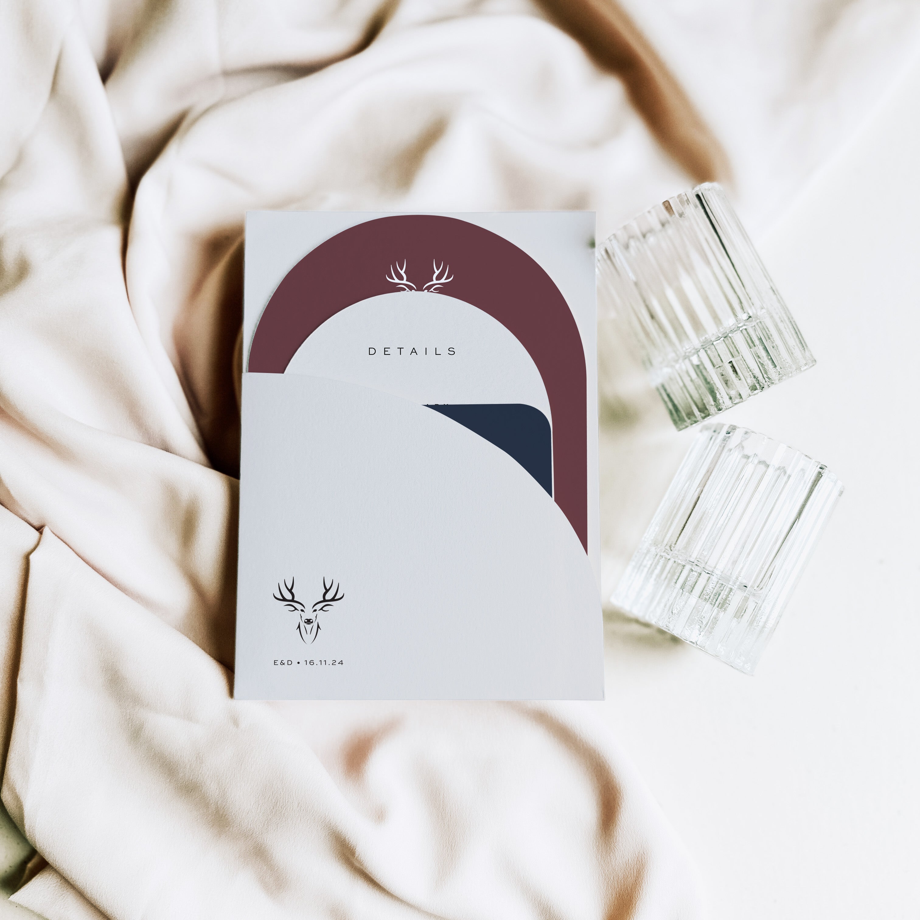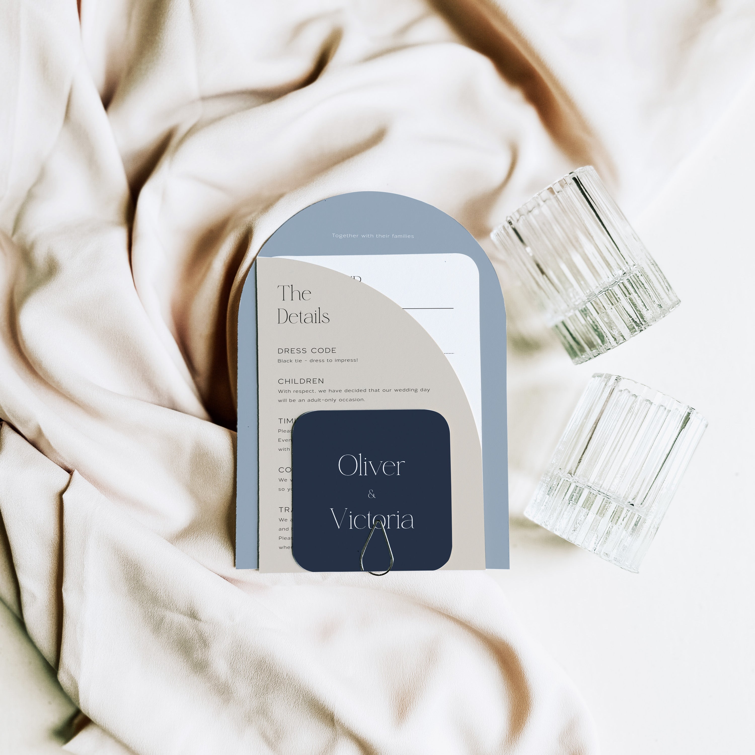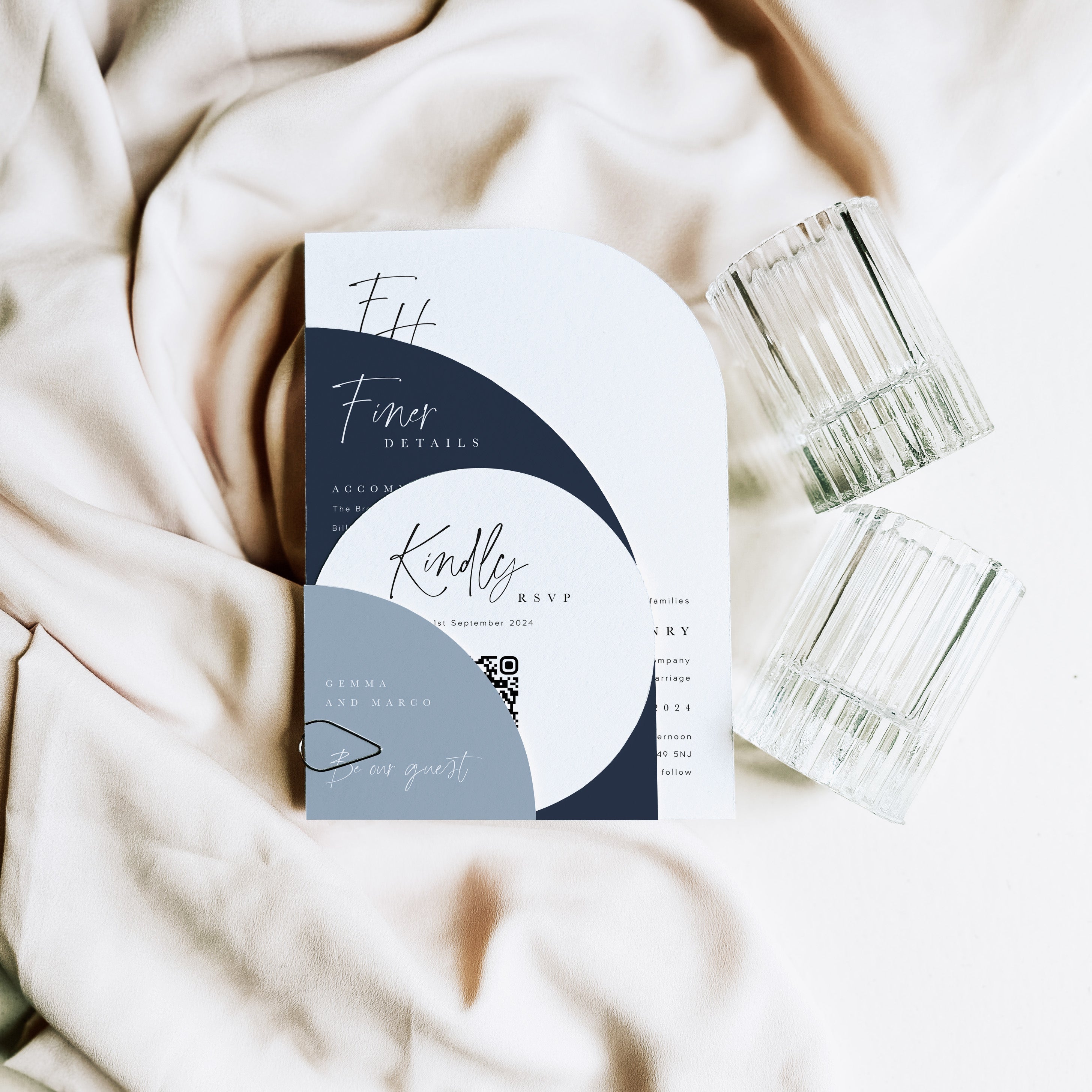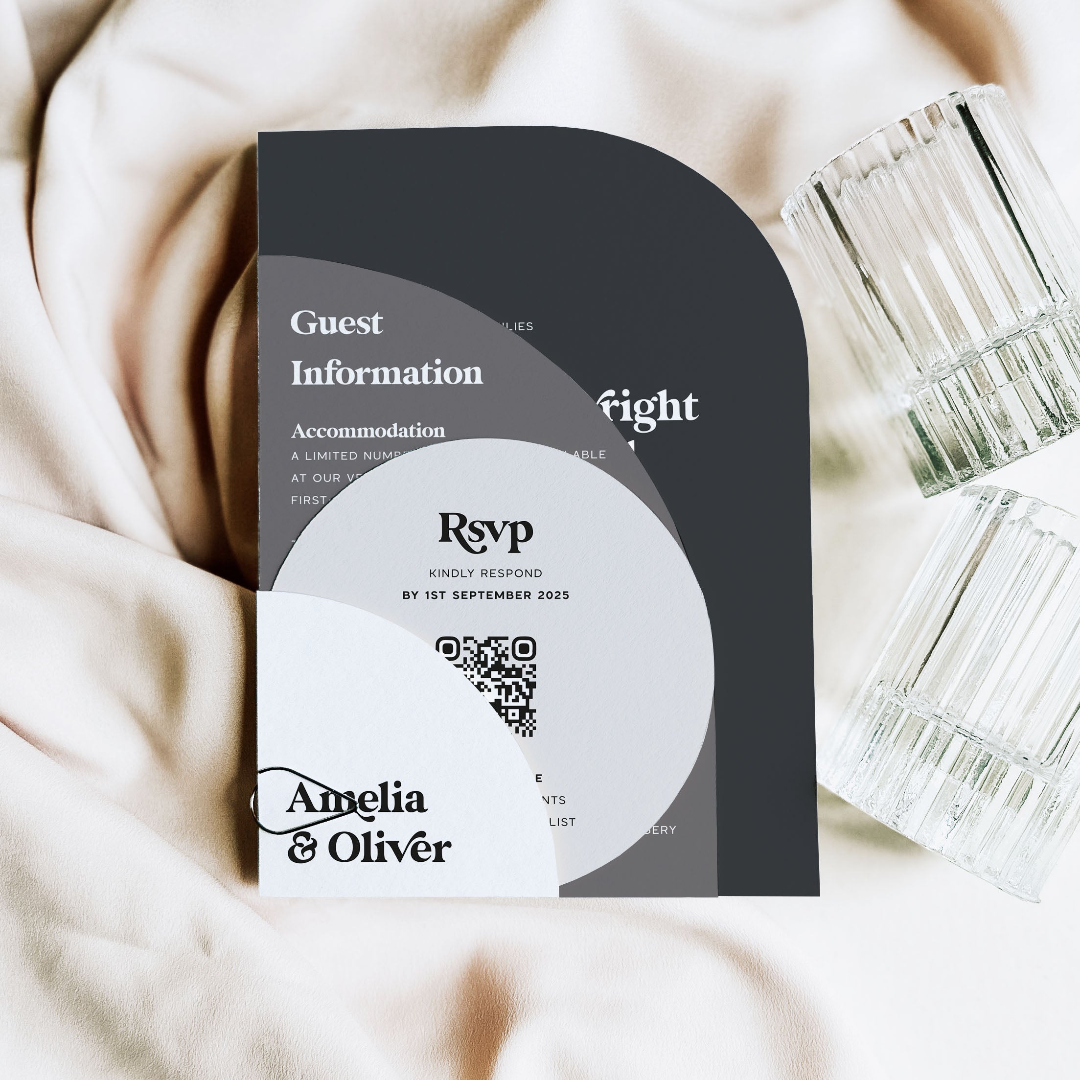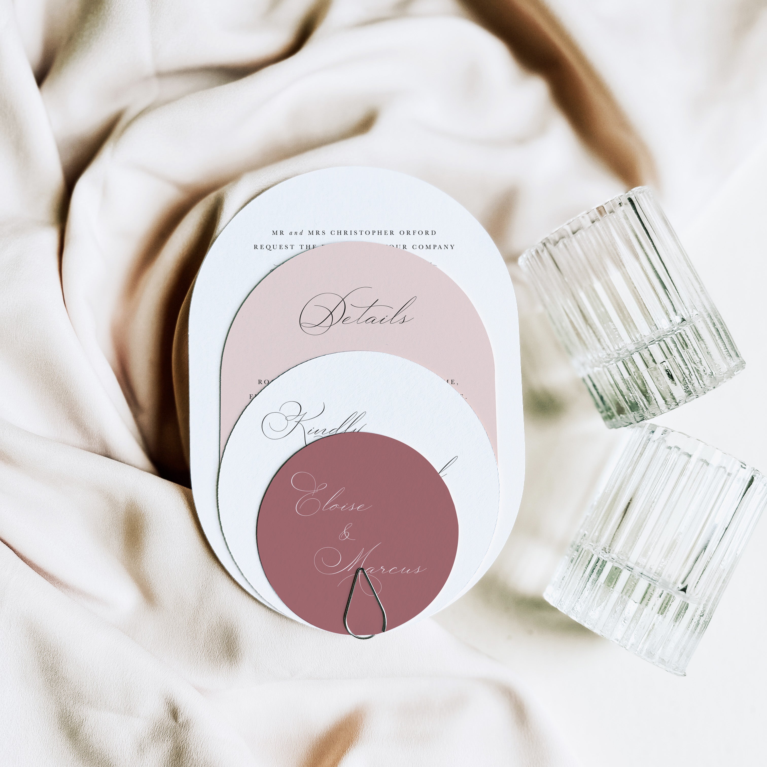Professionally die-cut using our on-site digital cutter - Vinny - our arched and shaped invitation suites are designed with colour customisation in mind, with colour and shape options for each individual piece. You can easily create either contrasting or harmonious schemes depending on your style.
