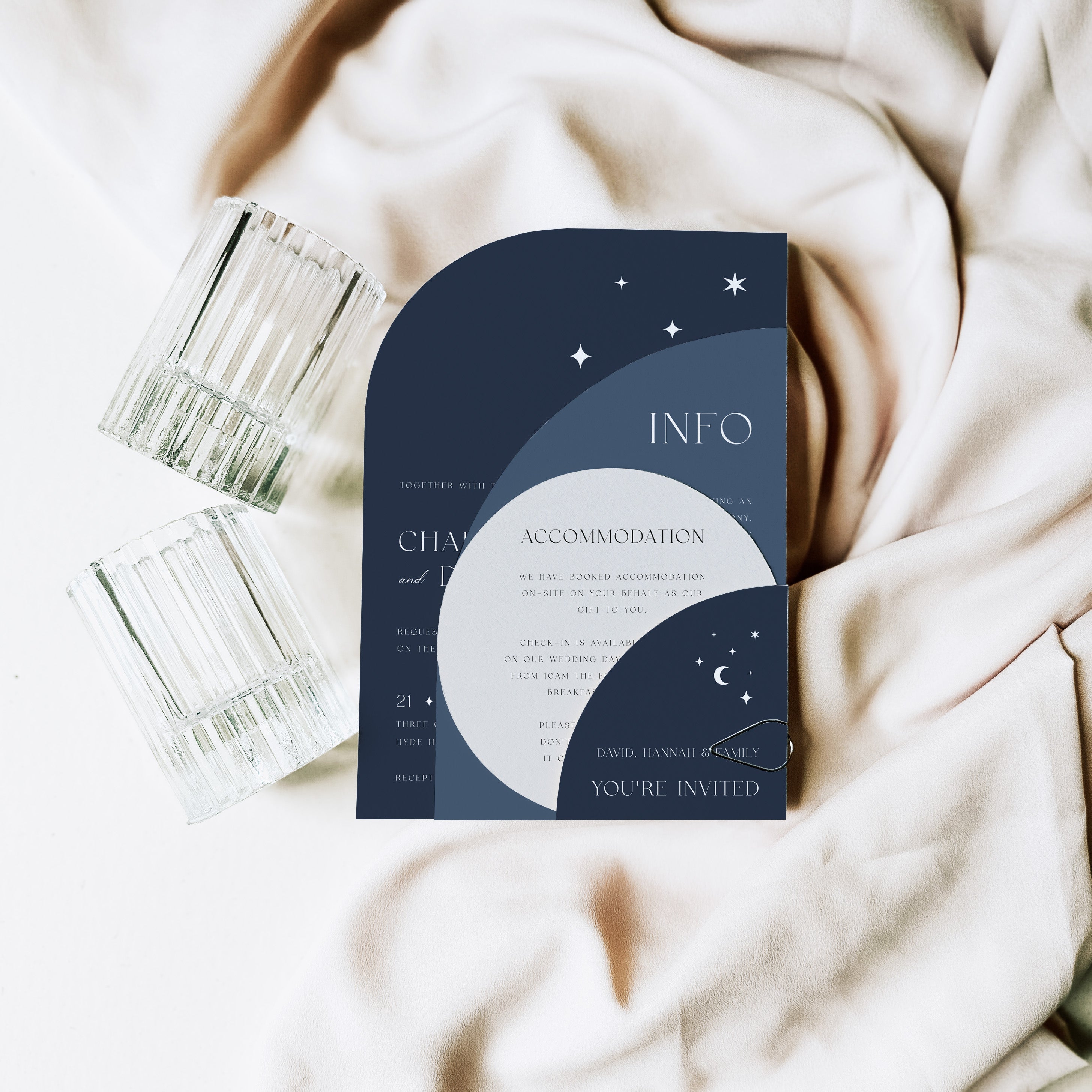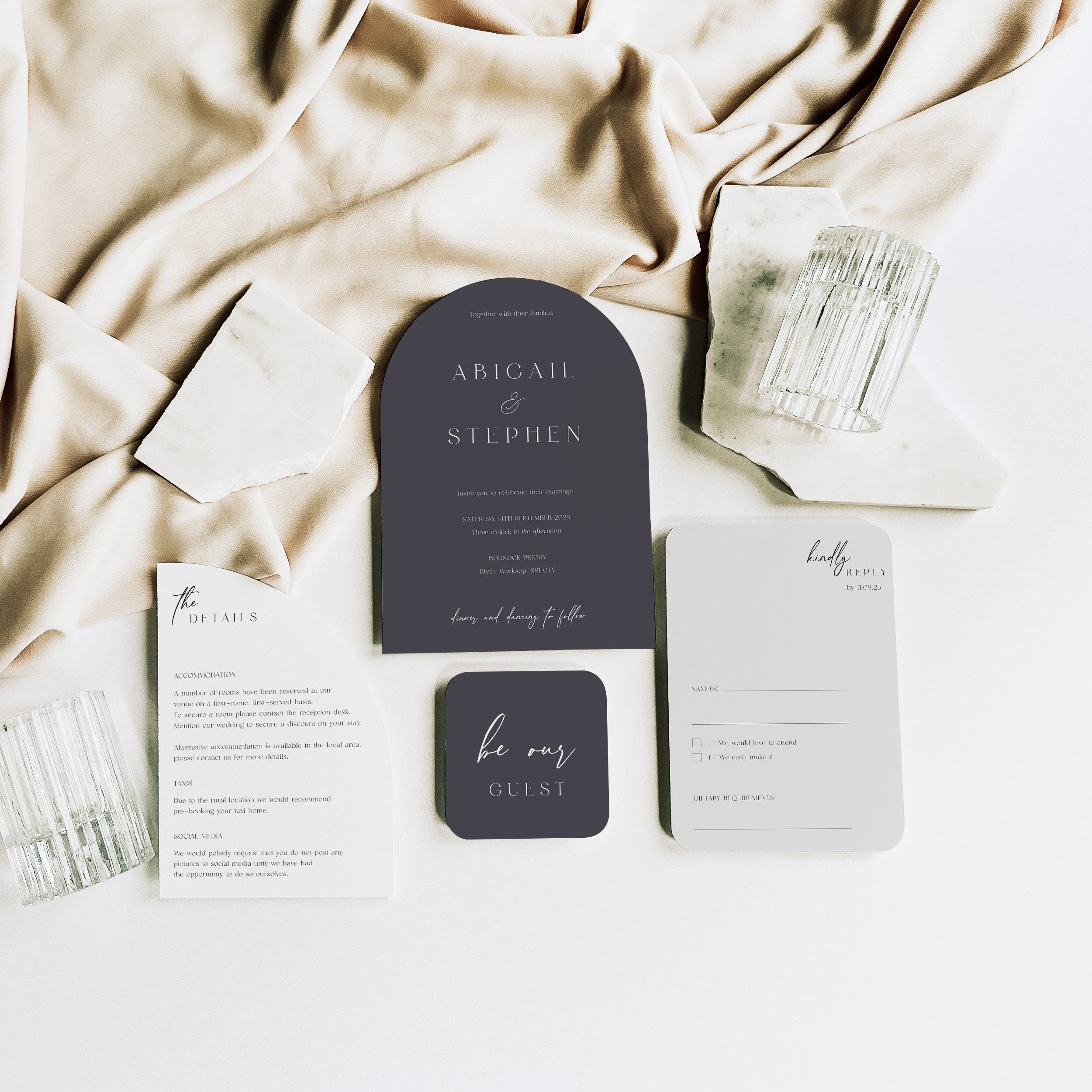 How much information you include with your invitations will depend on your event, as this differs from couple to couple. It’s for this reason that our invitations are versatile, enabling you only to order the pieces that you need. But we do recommend that less is more in most cases.