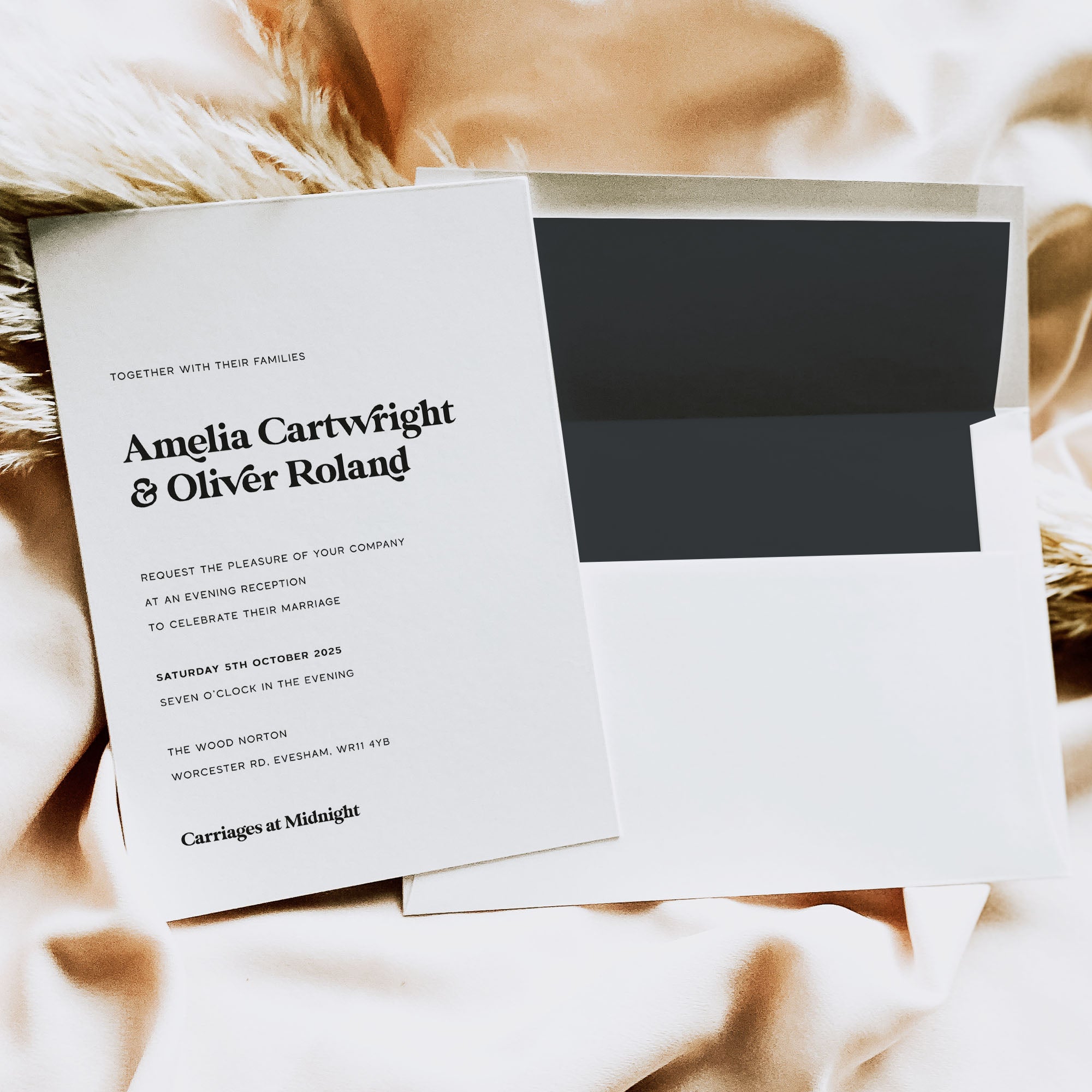 Evening invitations are often a lot simpler than all-day invitations as these guests won't need to pick menu options and information like confetti policies, ceremony-related timings, etc, won't be relevant.