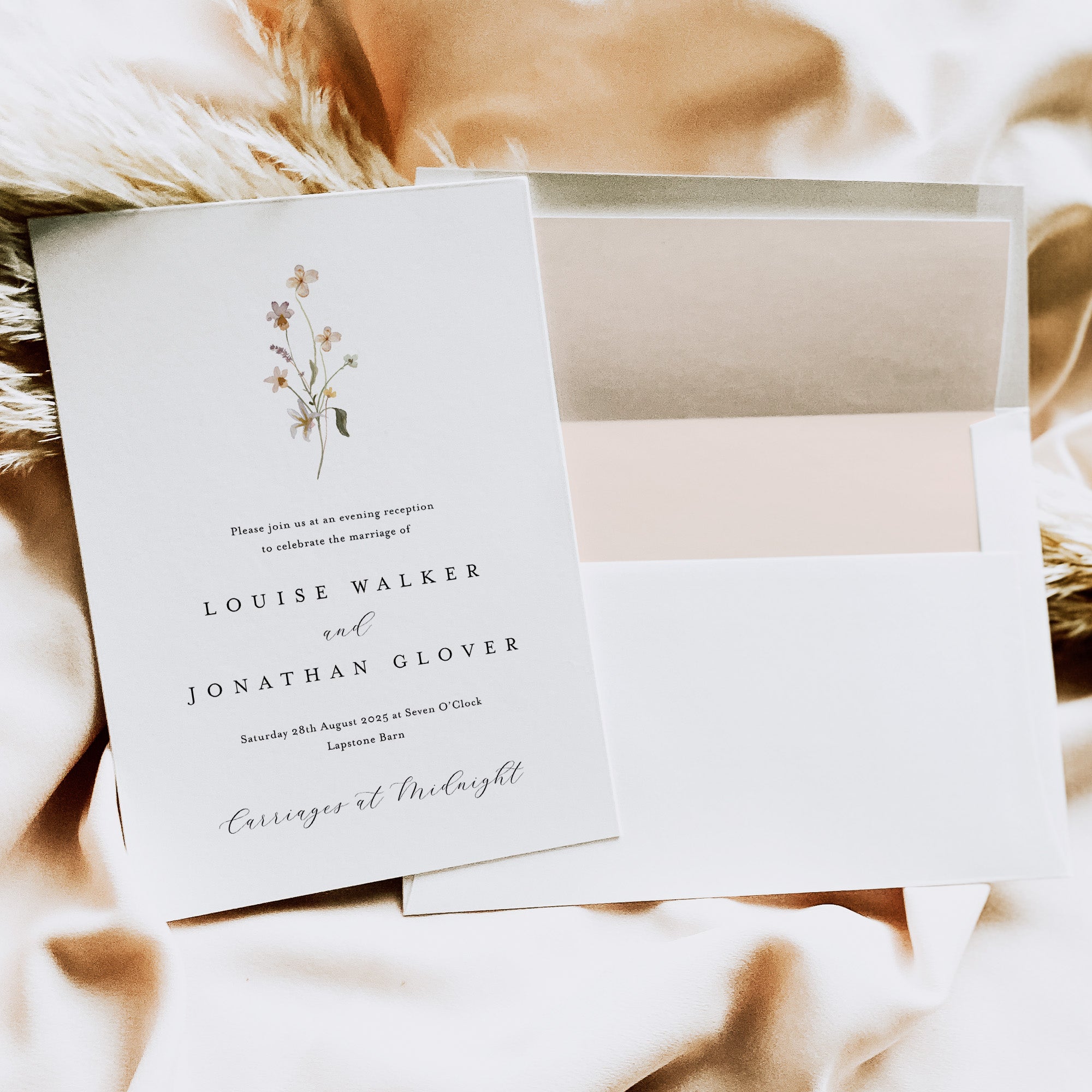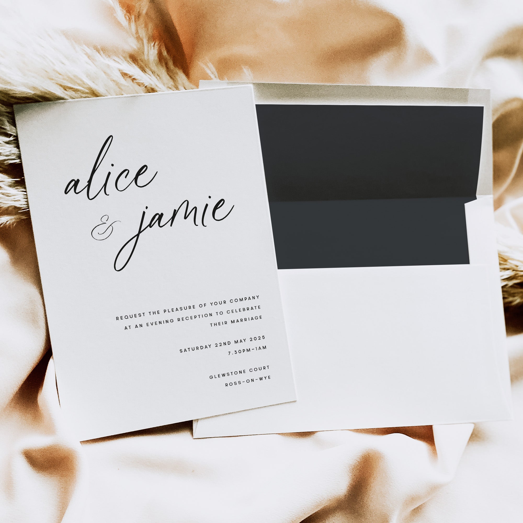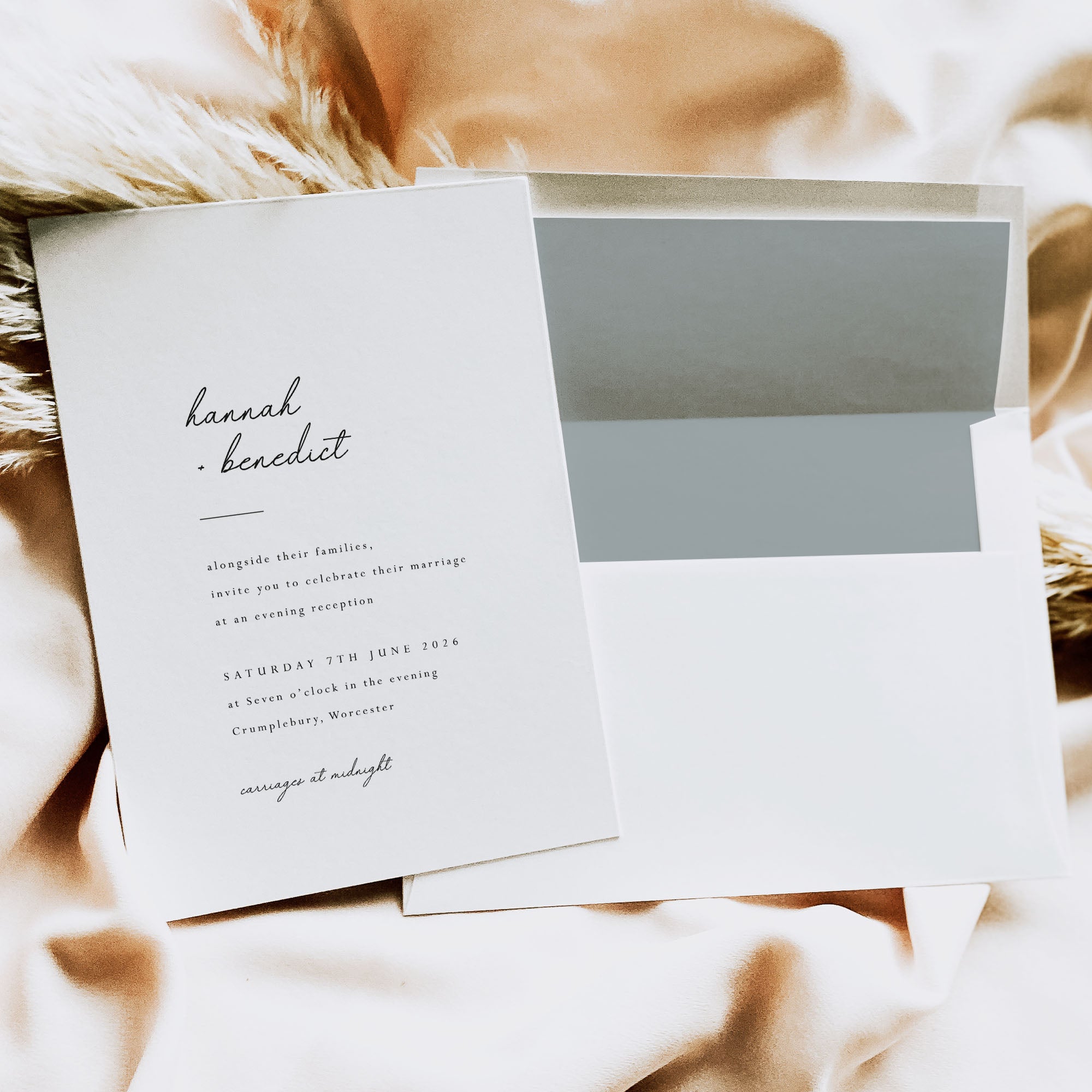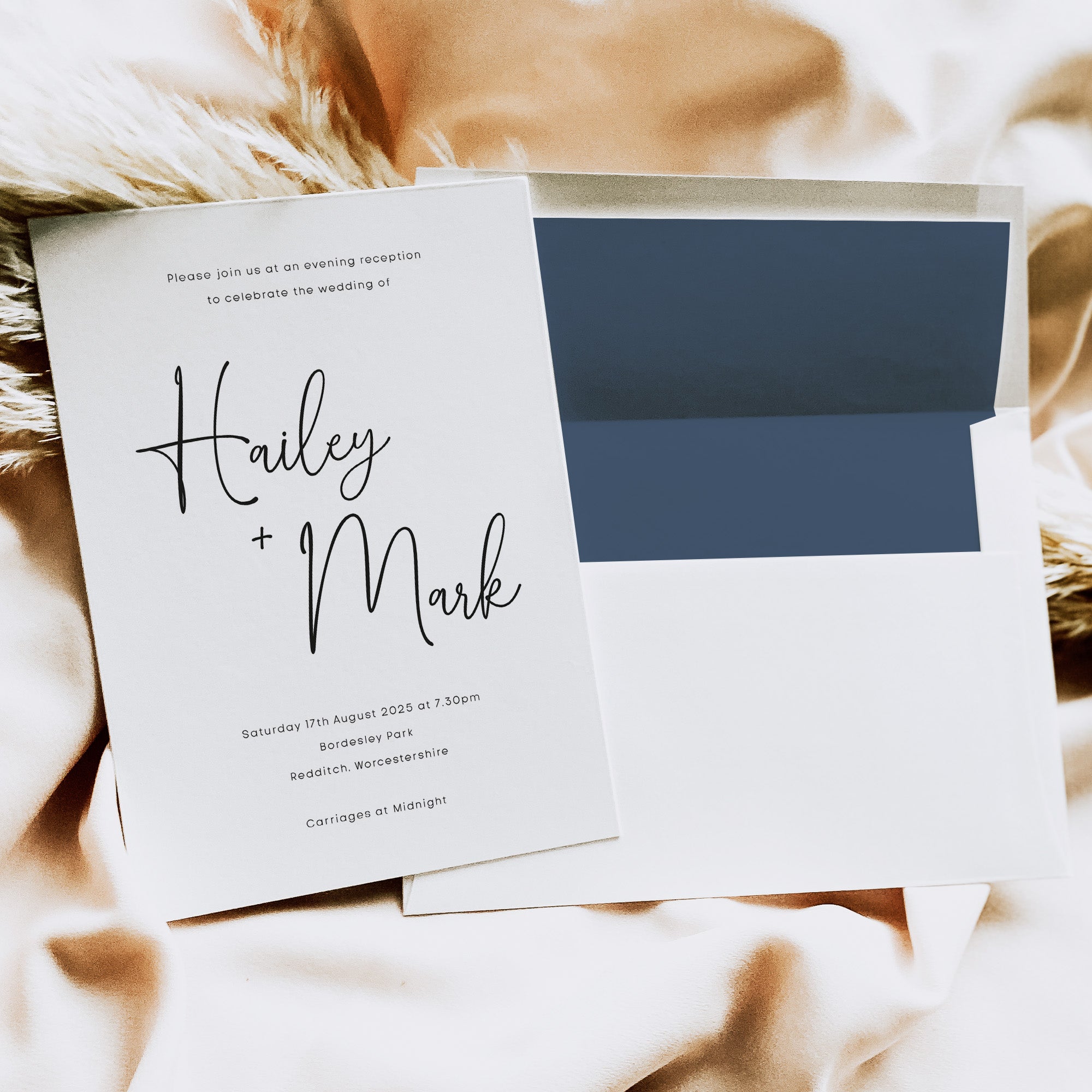 We have separate evening invitations that will match your day invitations for style but a lot simpler in their composition. These guests don’t often need as much information so the invitation can be stripped back quite a bit. So for example if you have a full invitation suite of 5 pieces for your main day invitation, it may be that a double-sided invitation card will be suitable for your evening-only guests.