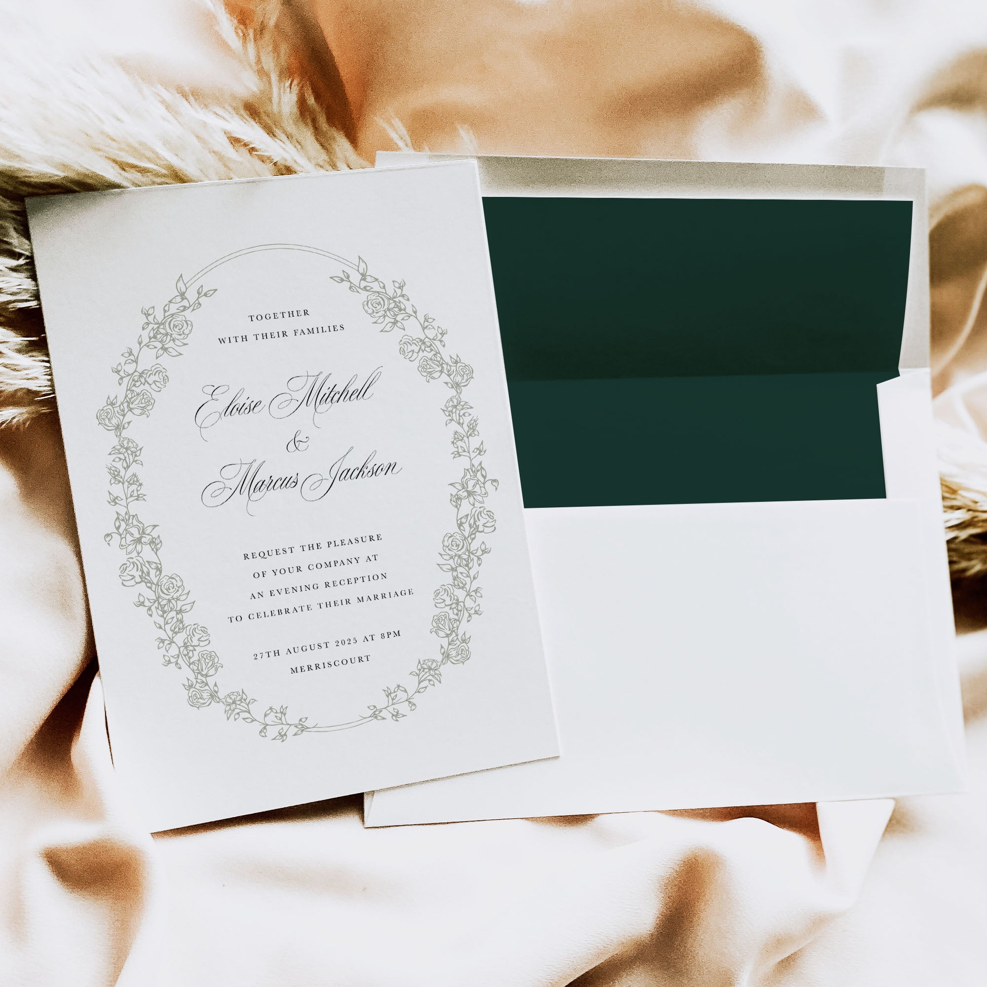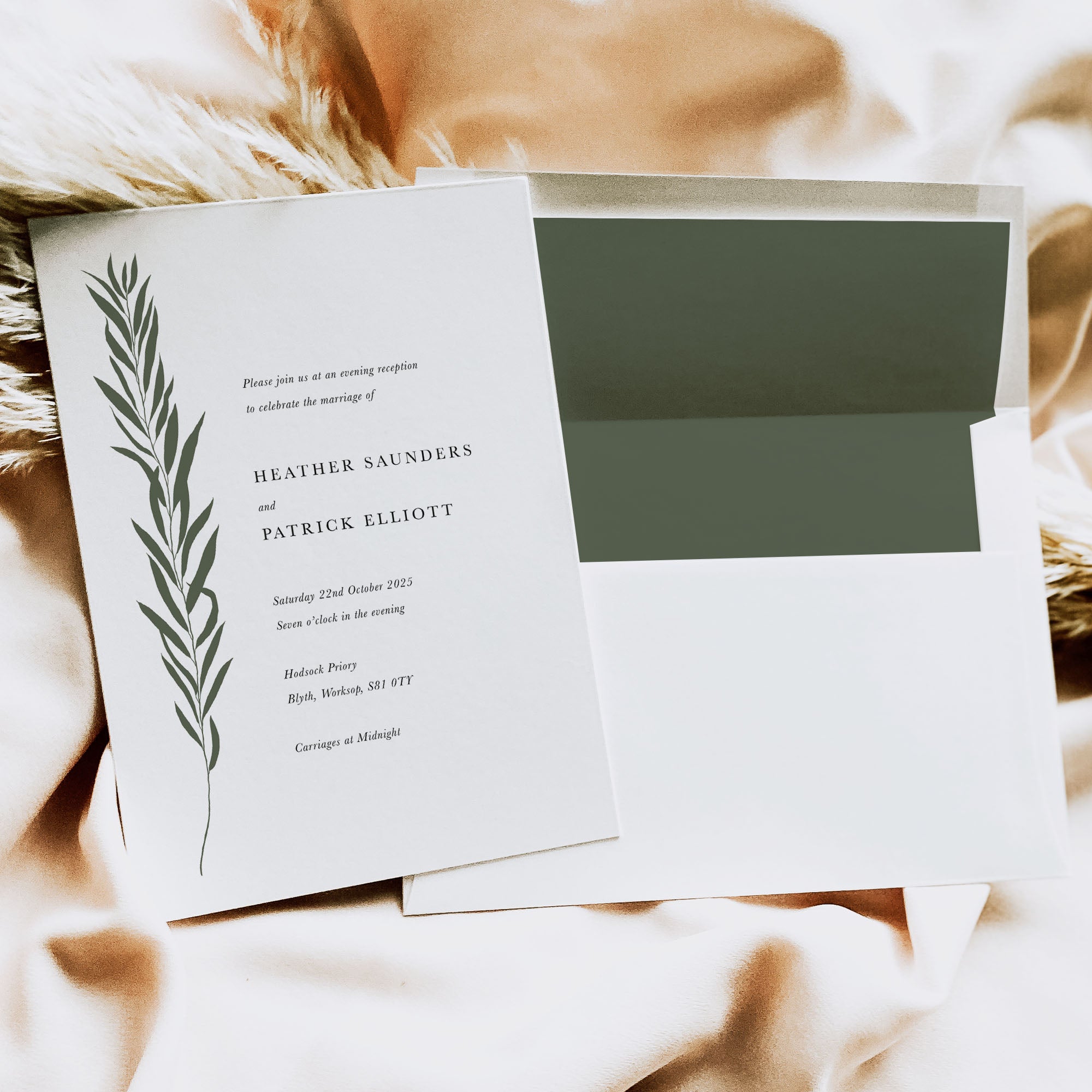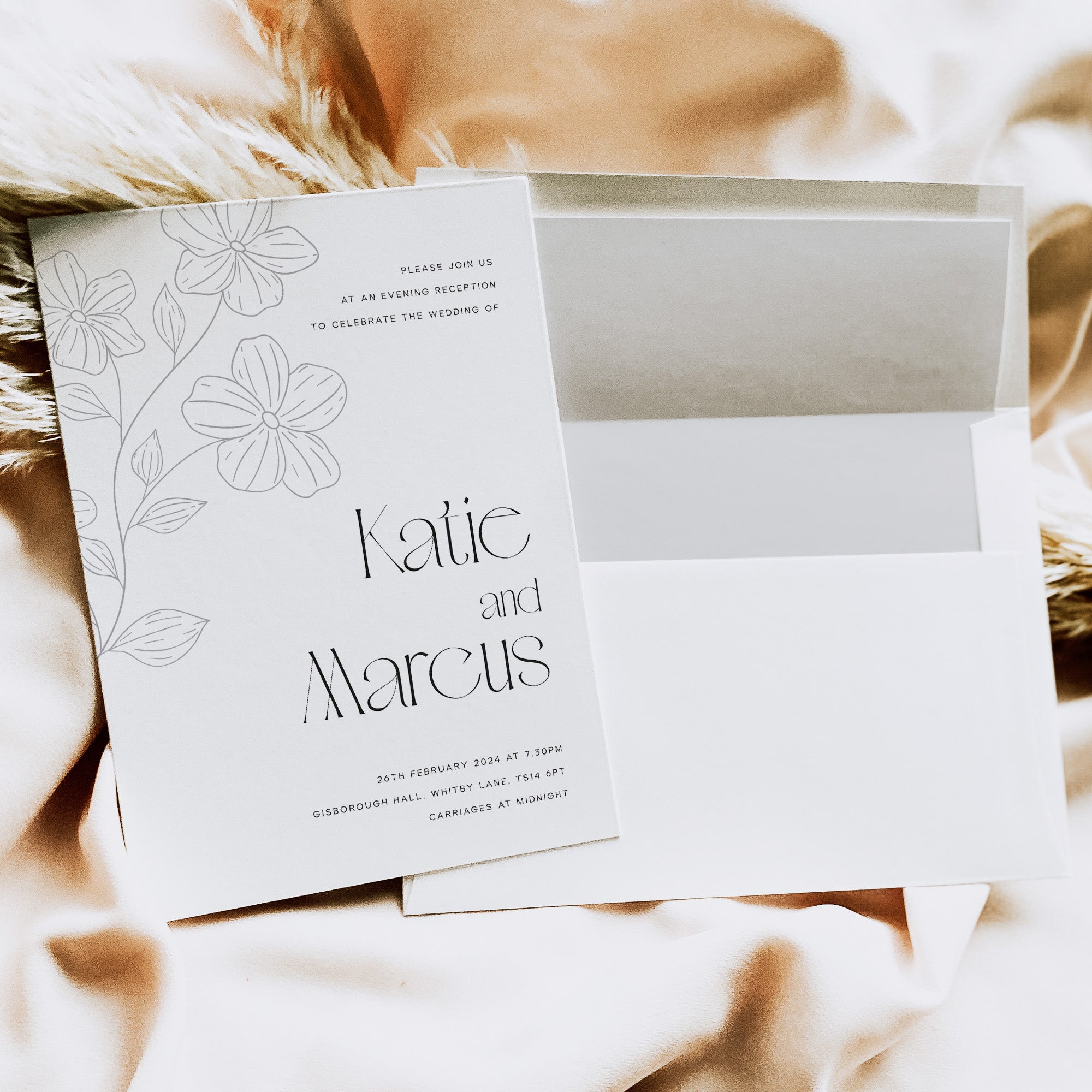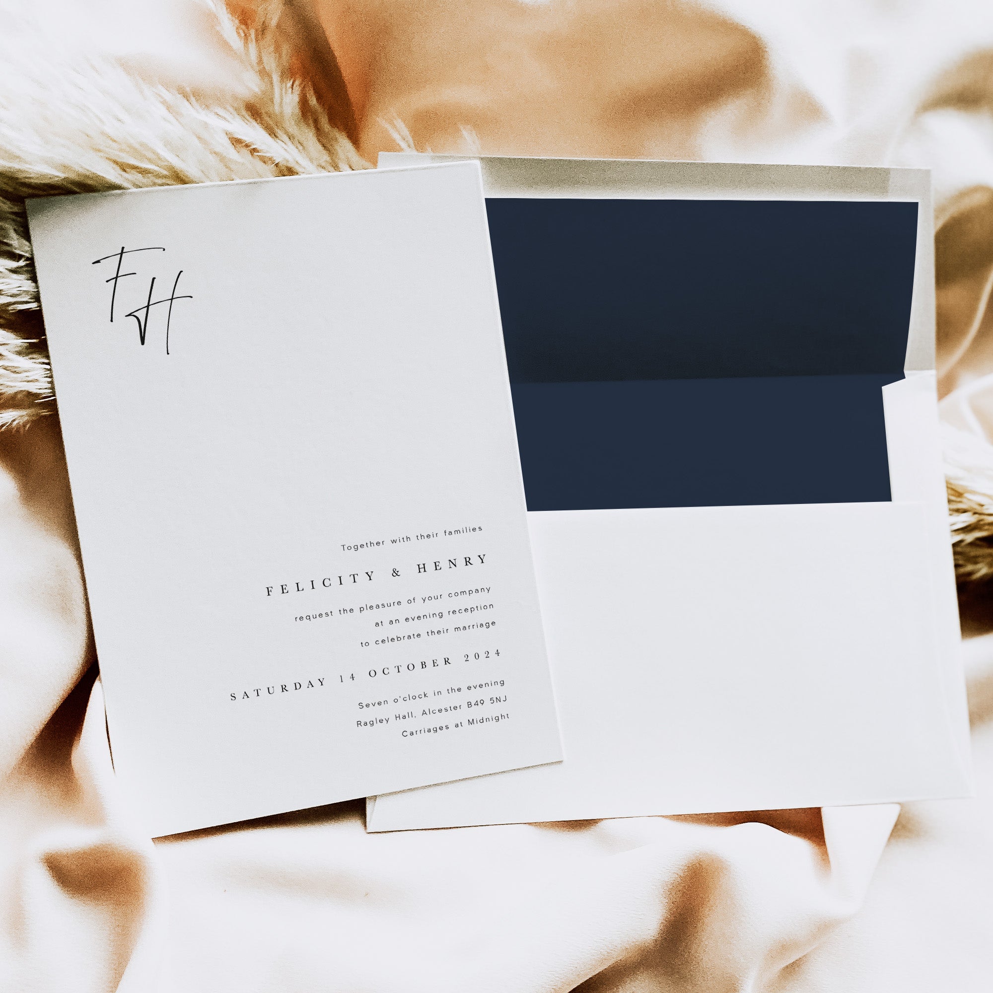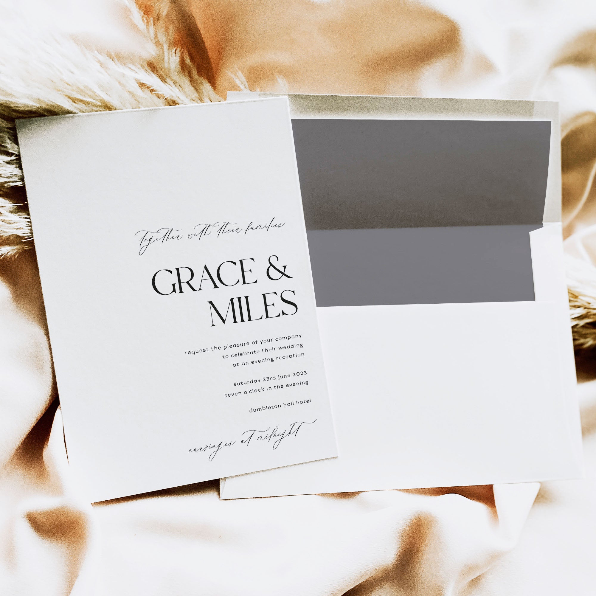 We have separate evening invitations that will match your day invitations for style but a lot simpler in their composition. These guests don’t often need as much information so the invitation can be stripped back quite a bit. So for example if you have a full invitation suite of 5 pieces for your main day invitation, it may be that a double-sided invitation card will be suitable for your evening-only guests.