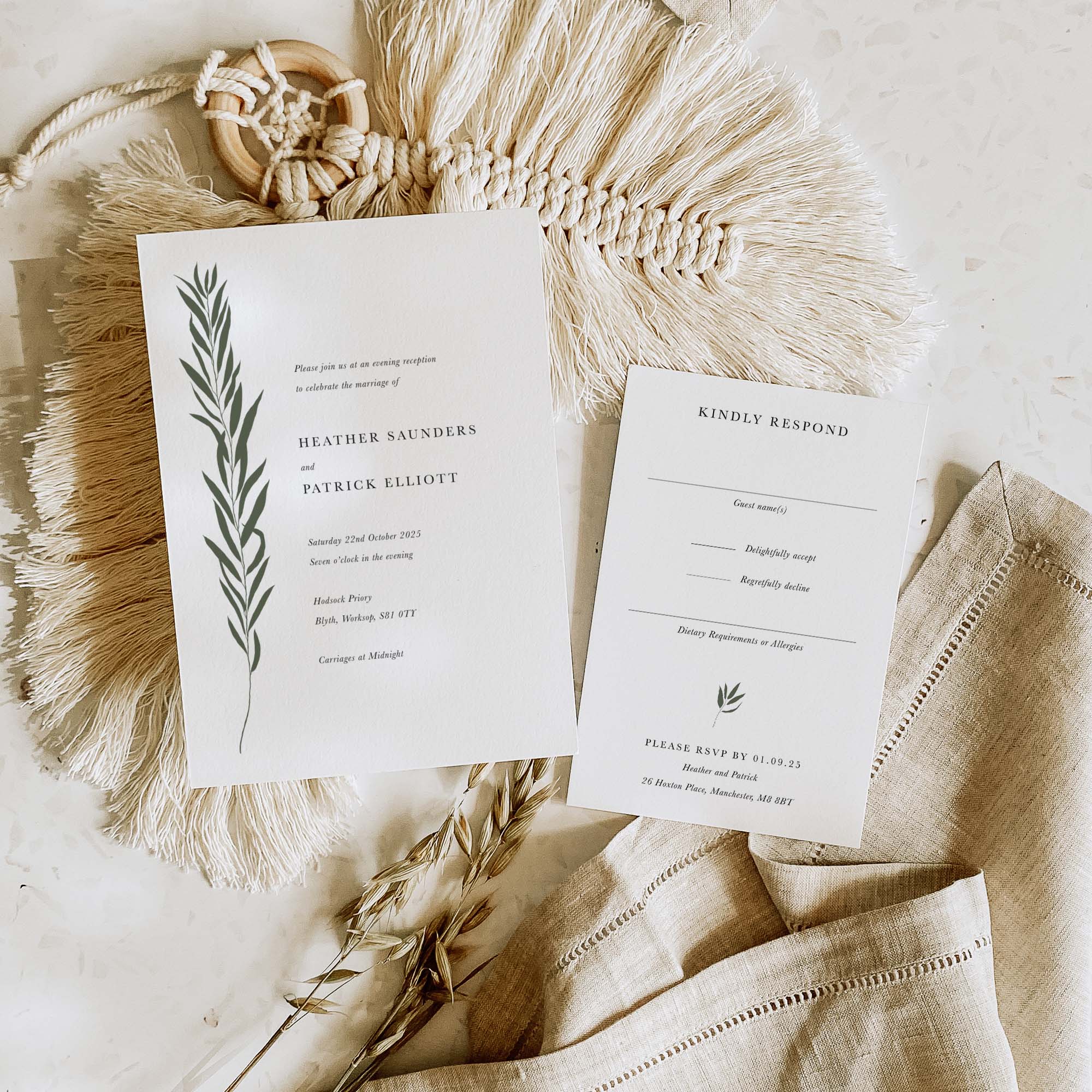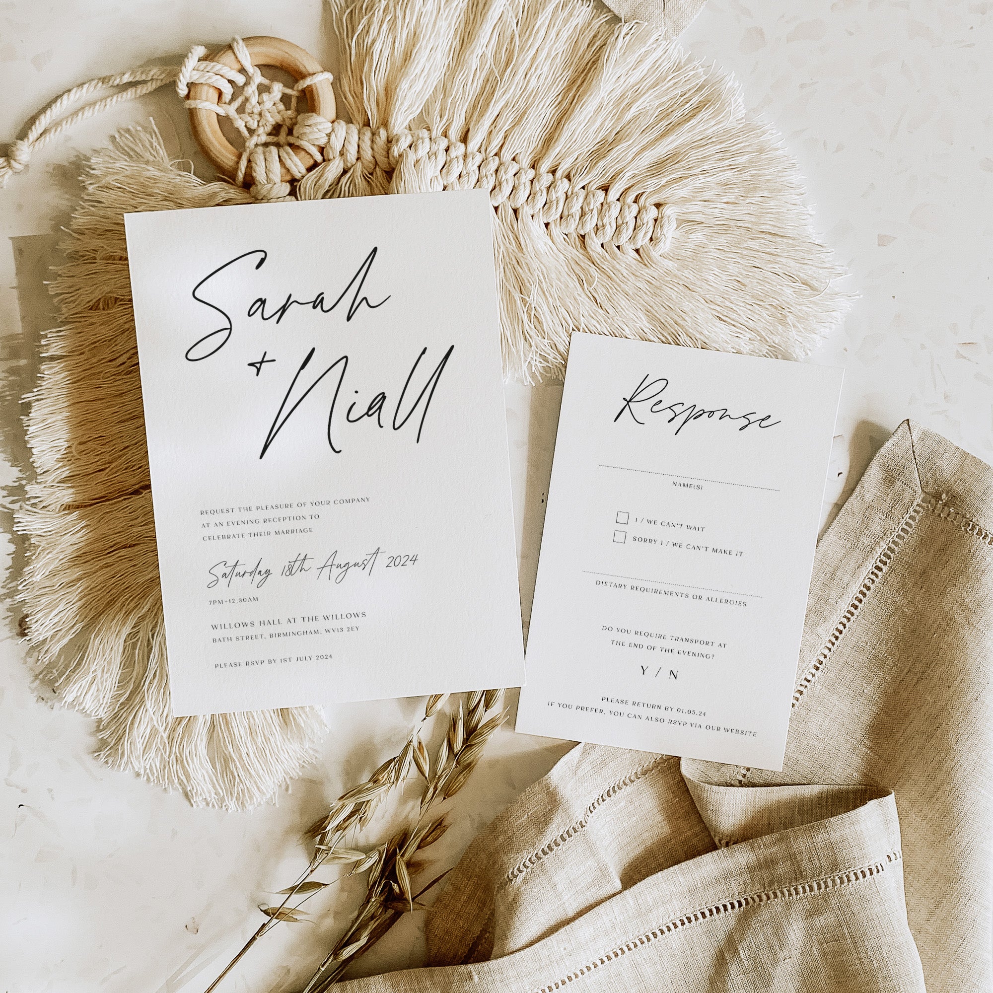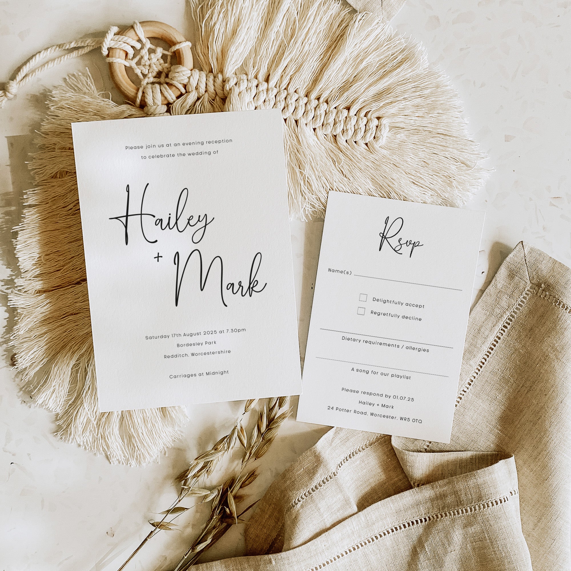 How much information you include with your invitations will depend on your event, as this differs from couple to couple. It’s for this reason that our invitations are versatile, enabling you only to order the pieces that you need. But we do recommend that less is more in most cases.