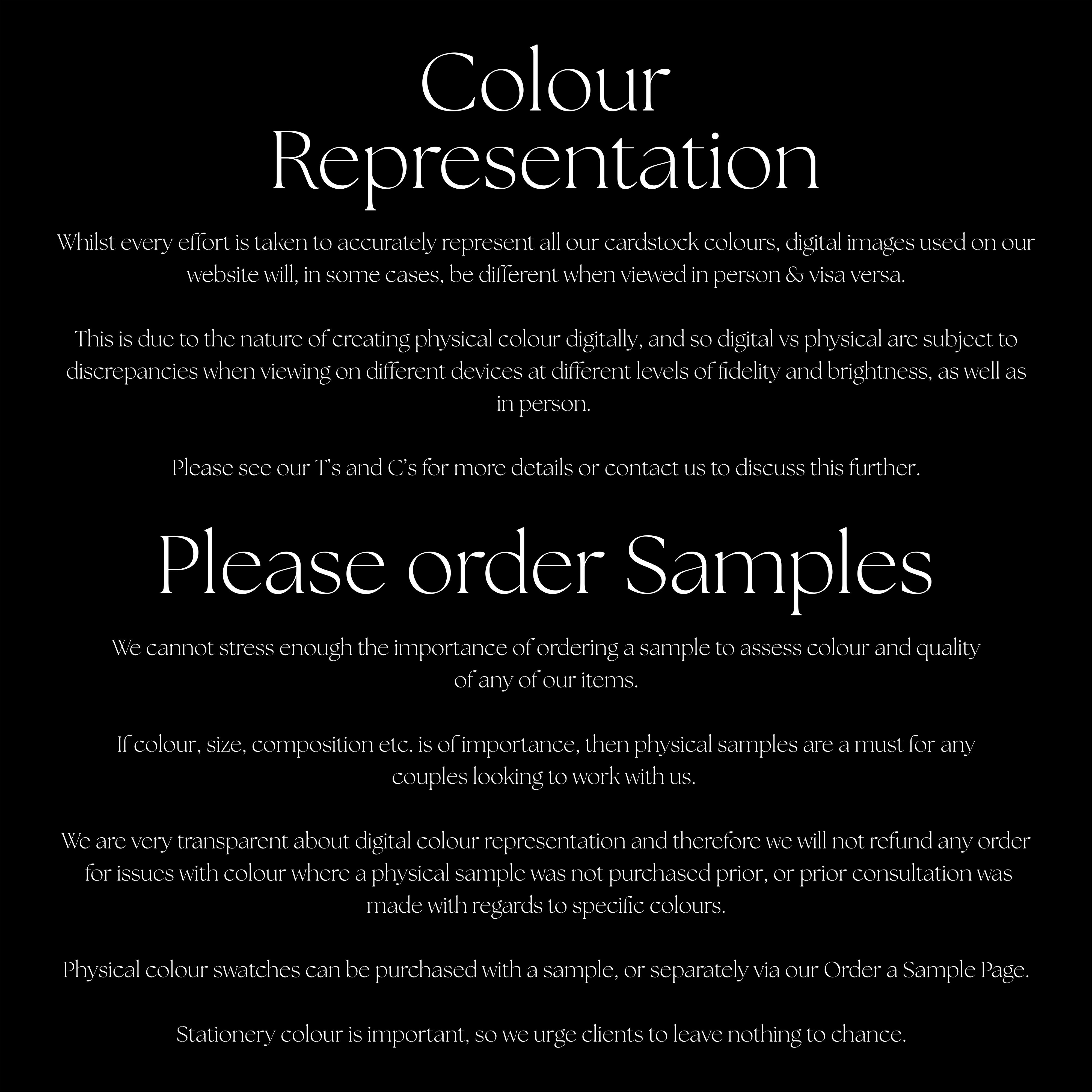 Our standard invitations / suites are digitally printed on 300-350gsm cardstock, with the option of white ink printing on darker shades.