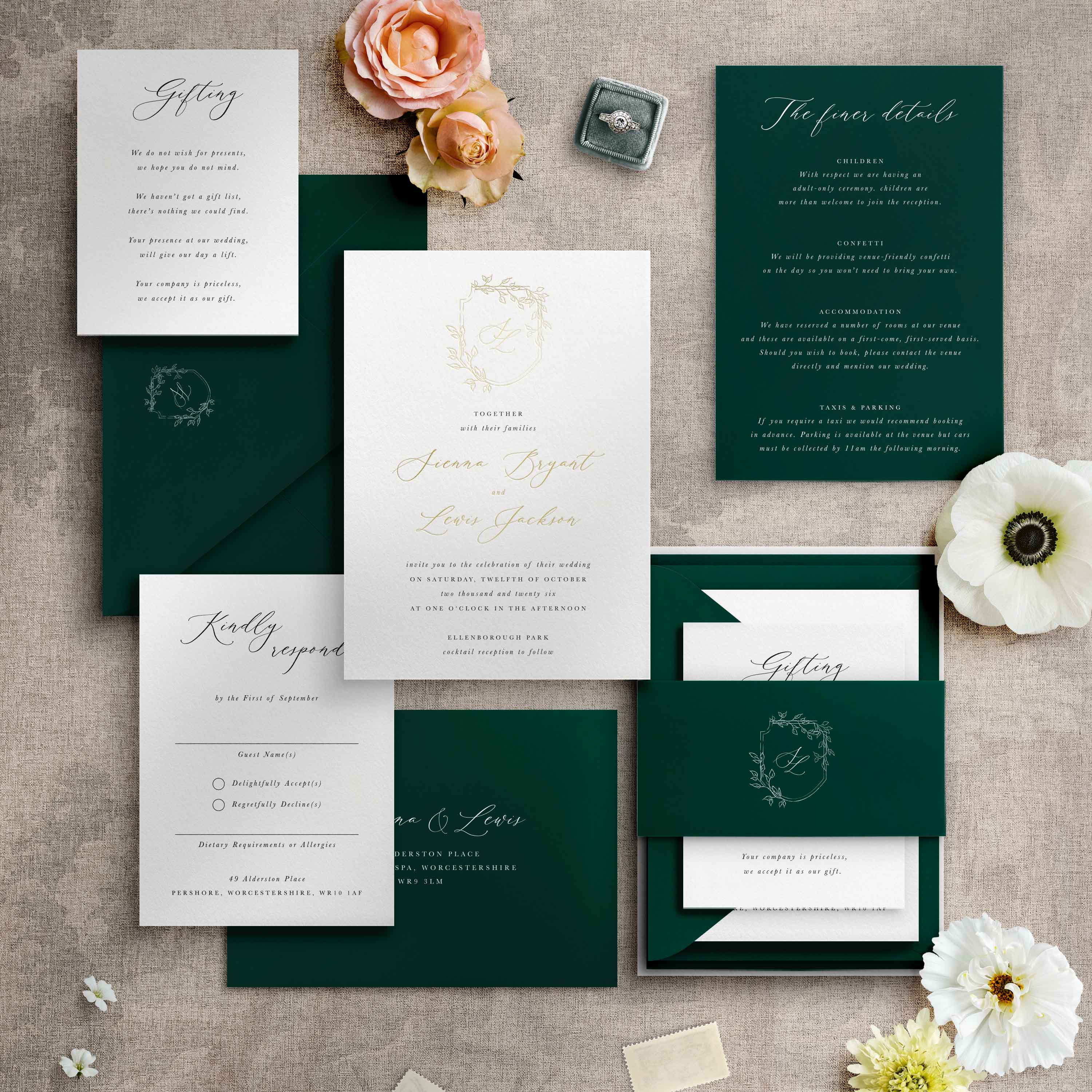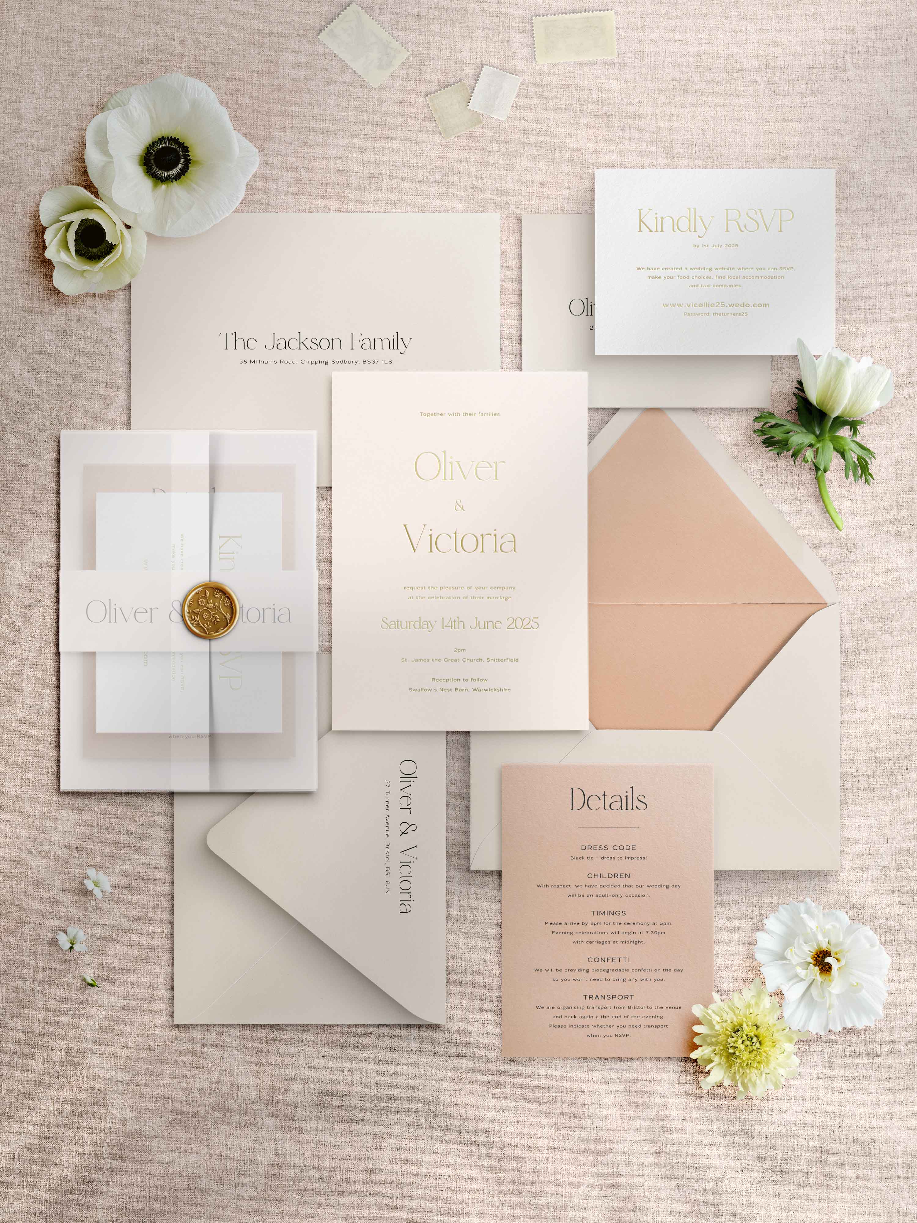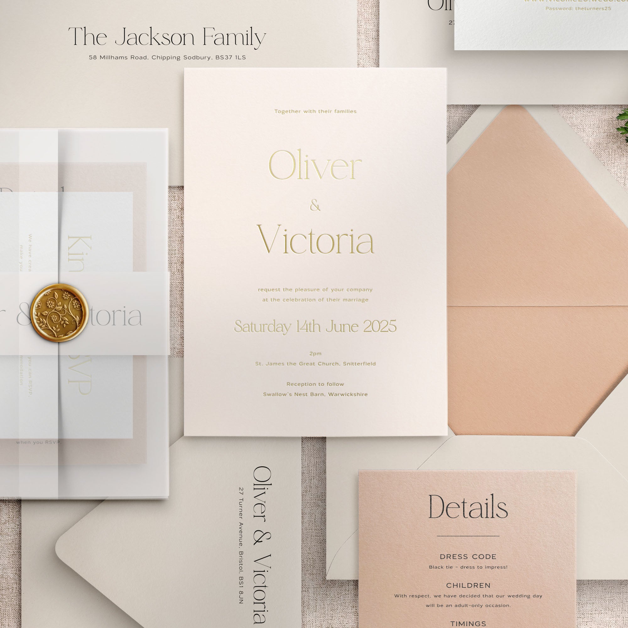 Additional advice would be to keep information concise where you can and, if possible, use a wedding website for a lot of your long-form, conversational wording. This can ensure you can put more of your budget into the styling of your invitations.