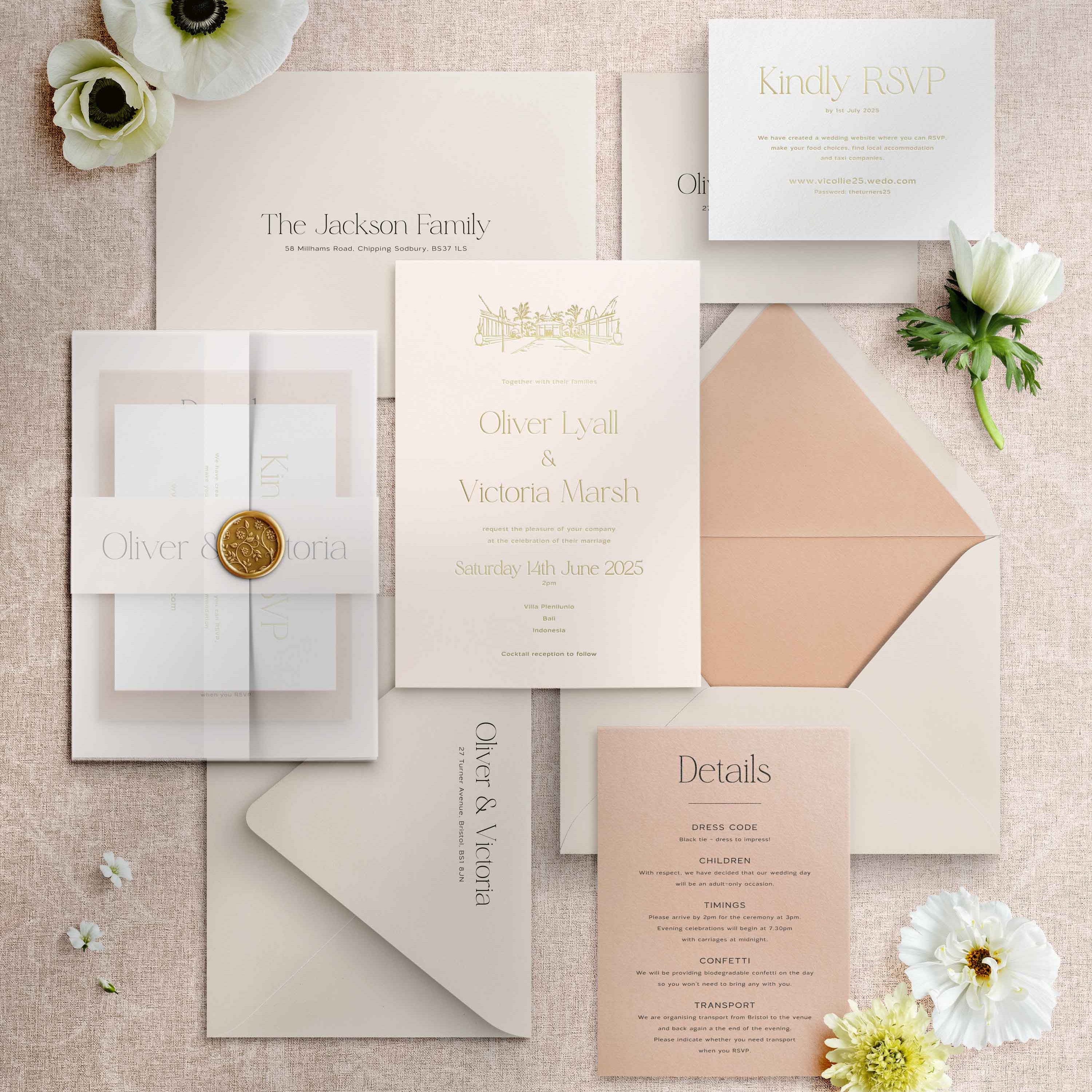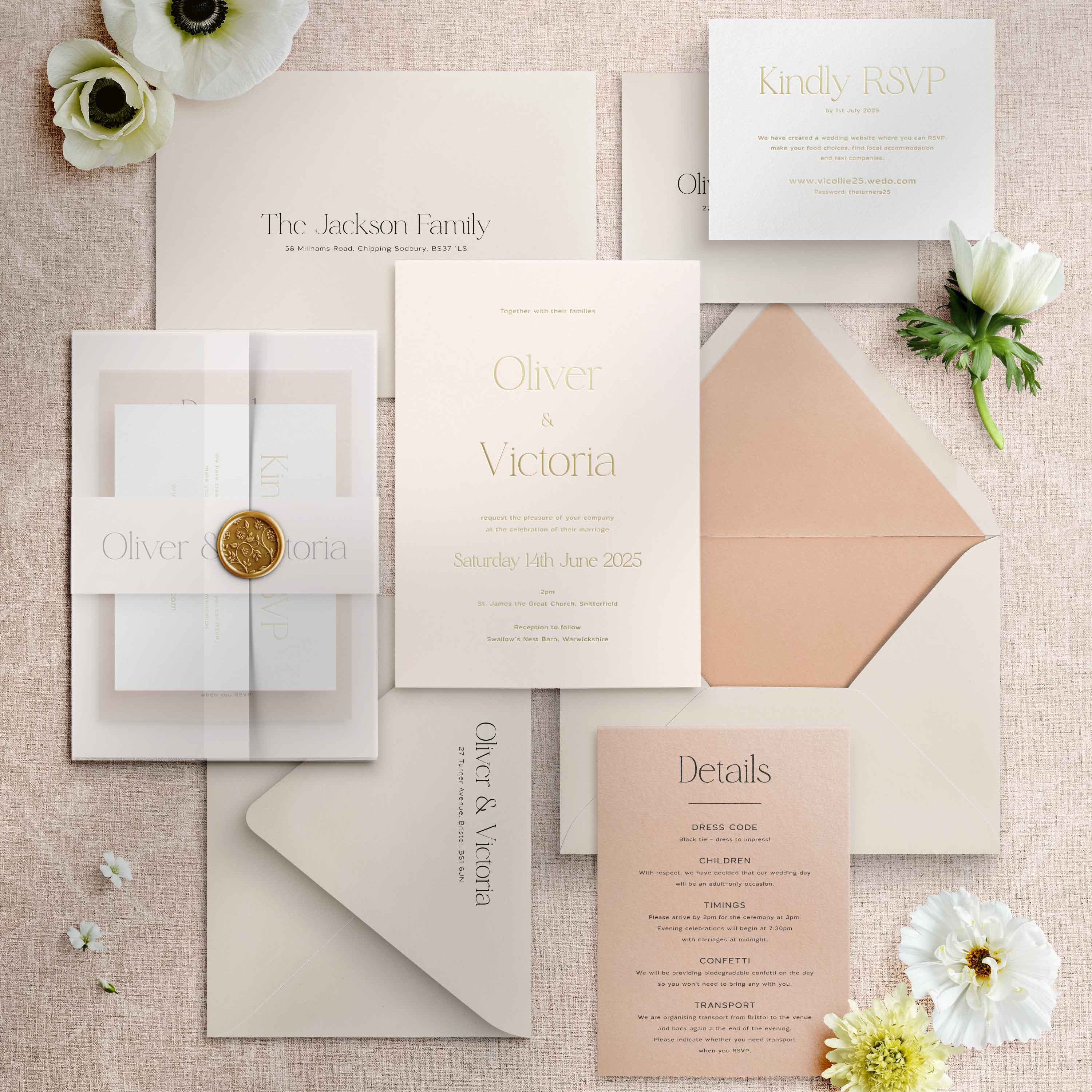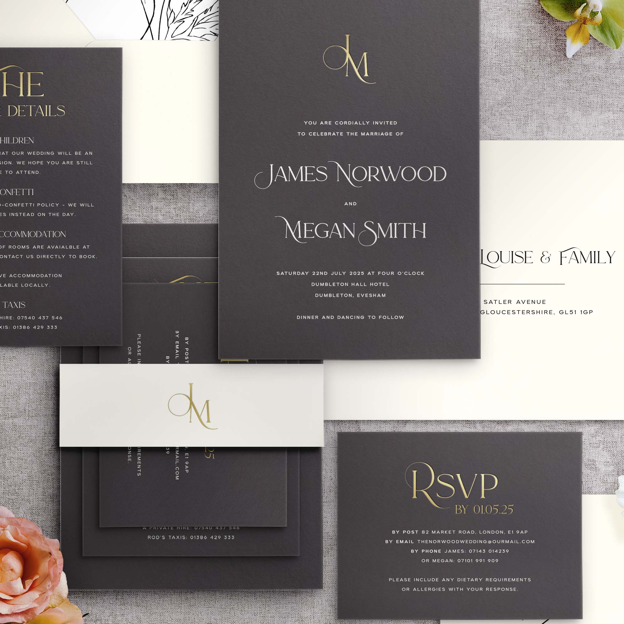 Additional advice would be to keep information concise where you can and, if possible, use a wedding website for a lot of your long-form, conversational wording. This can ensure you can put more of your budget into the styling of your invitations.