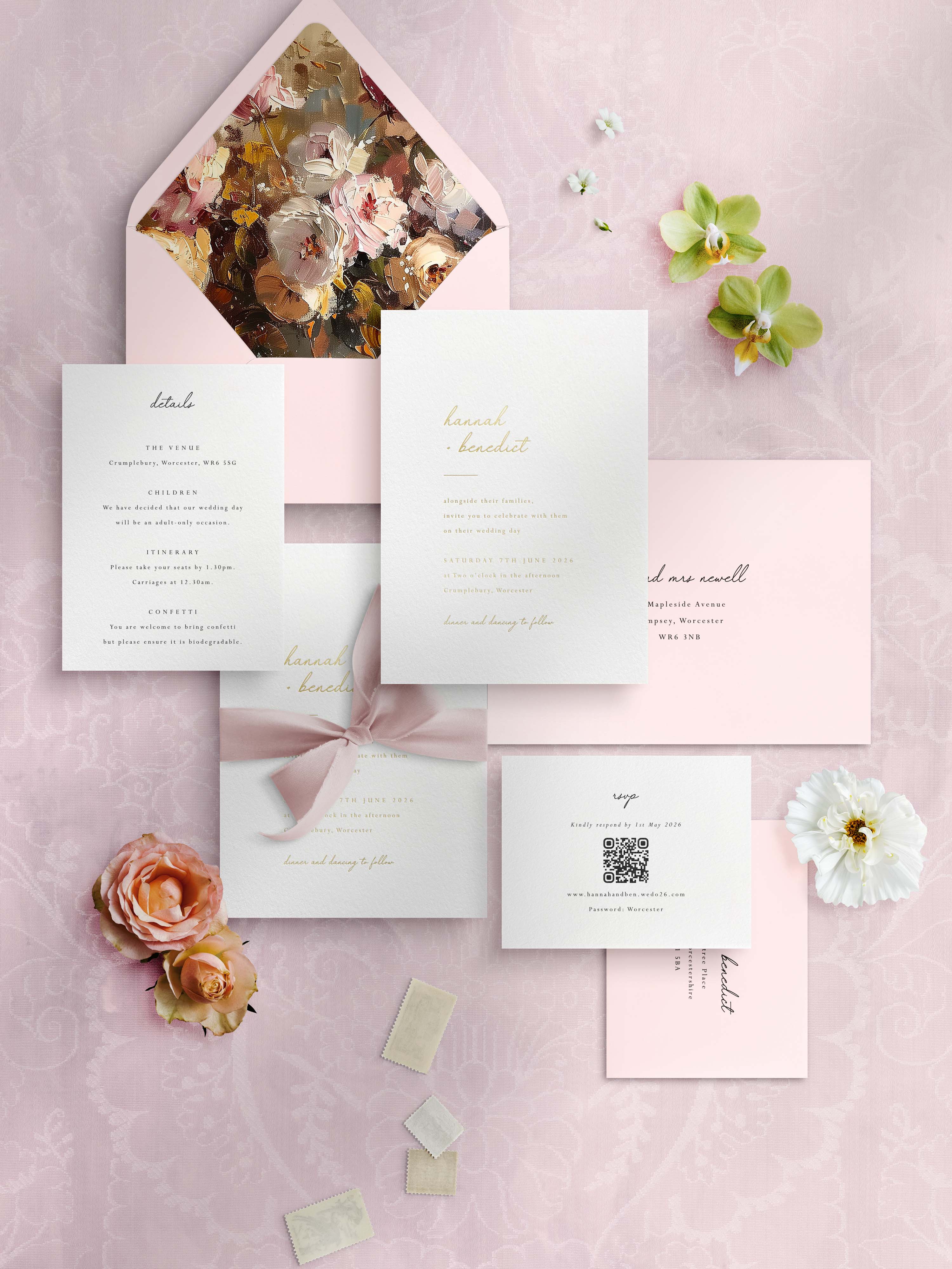 Additional advice would be to keep information concise where you can and, if possible, use a wedding website for a lot of your long-form, conversational wording. This can ensure you can put more of your budget into the styling of your invitations.