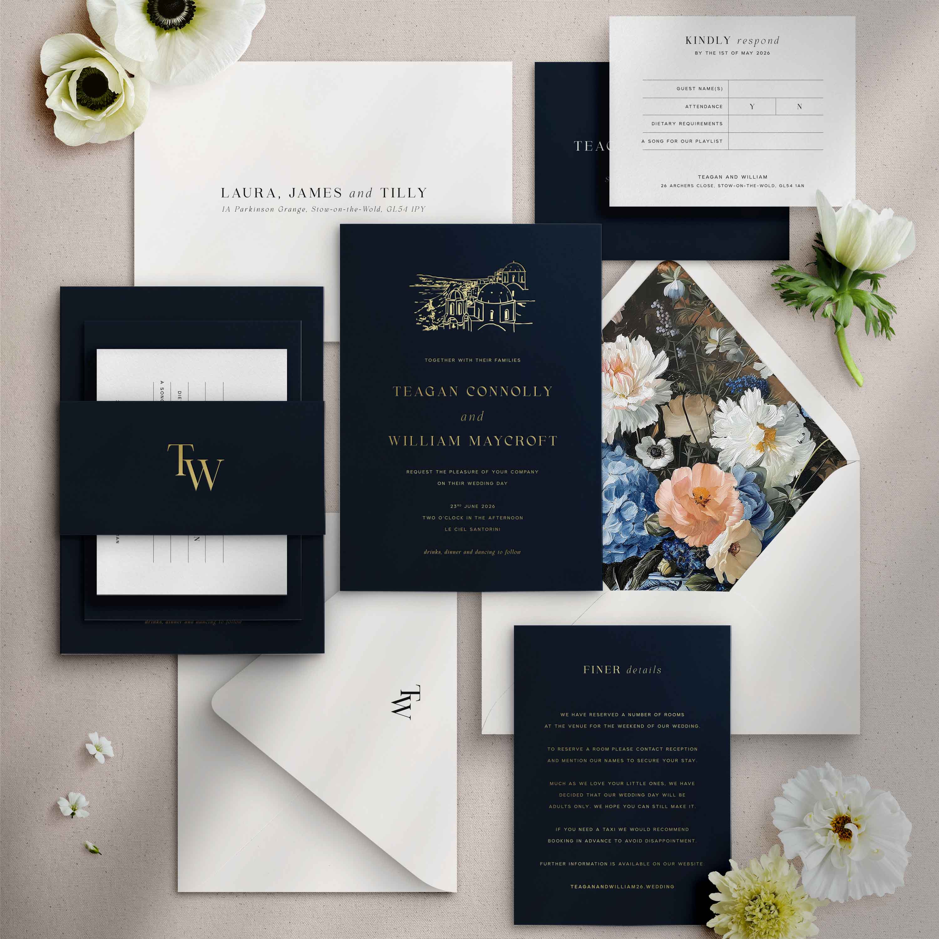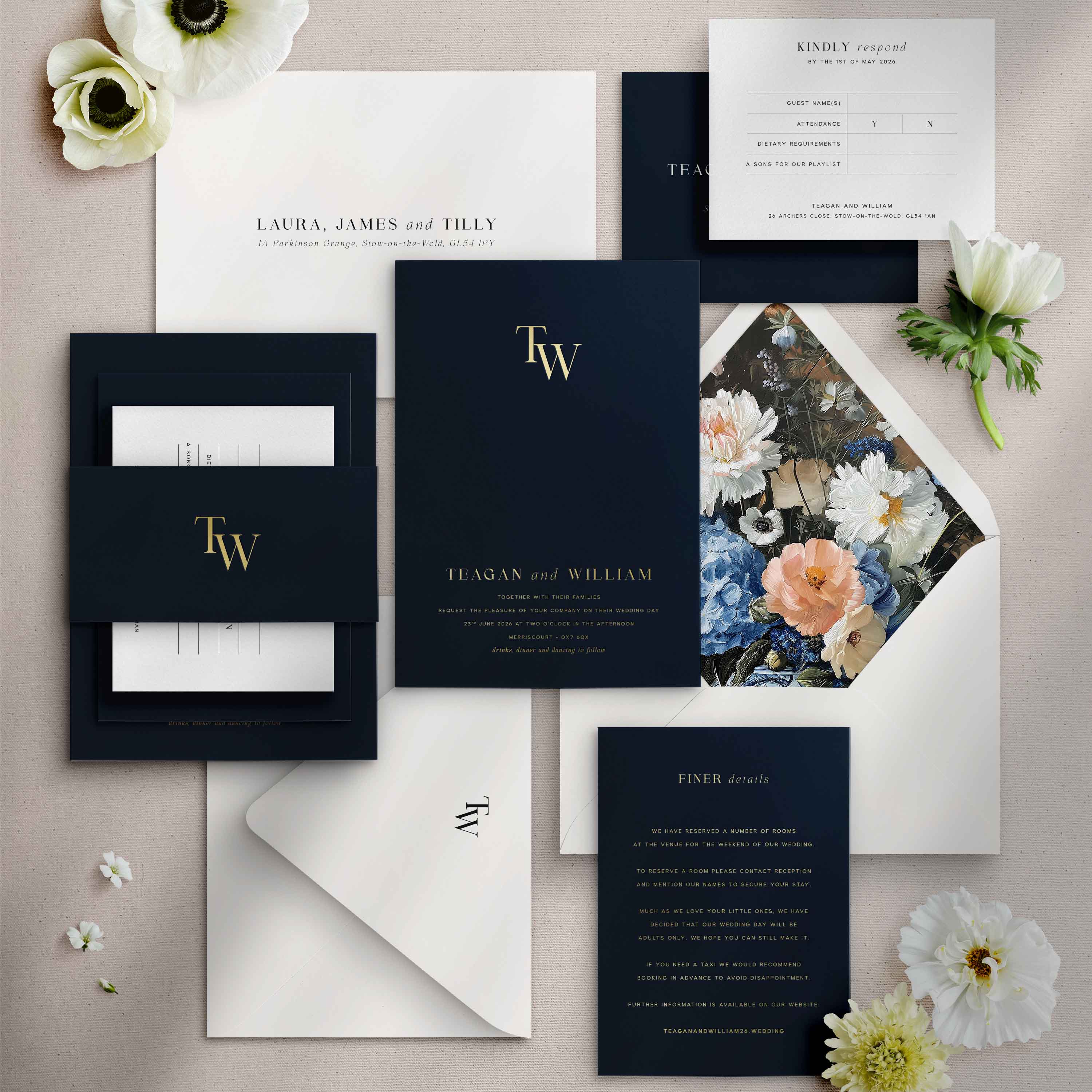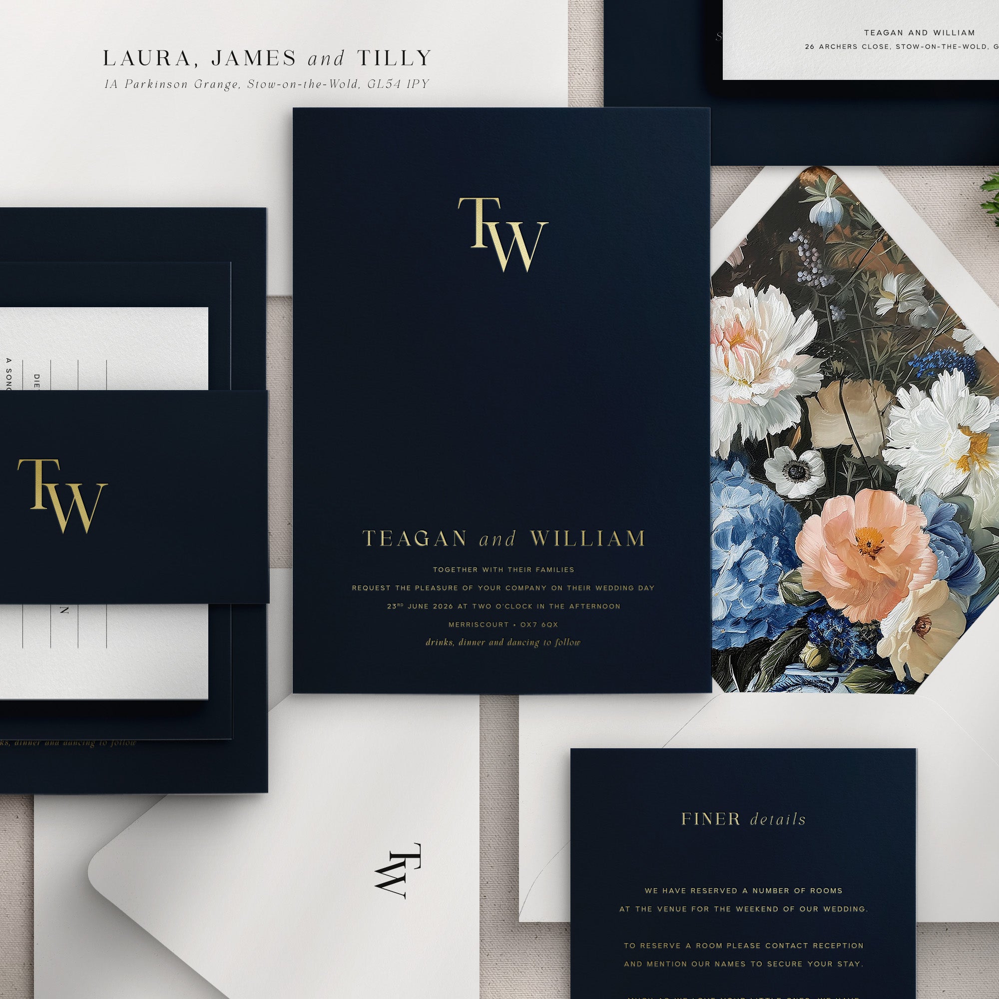 Hot foiling invitations is very flexible and can be used in a number of ways. You can opt to have full foiling for all pieces, foil only specific elements such as your names or monogram for impact, add blind debossing or embossing, and so on.