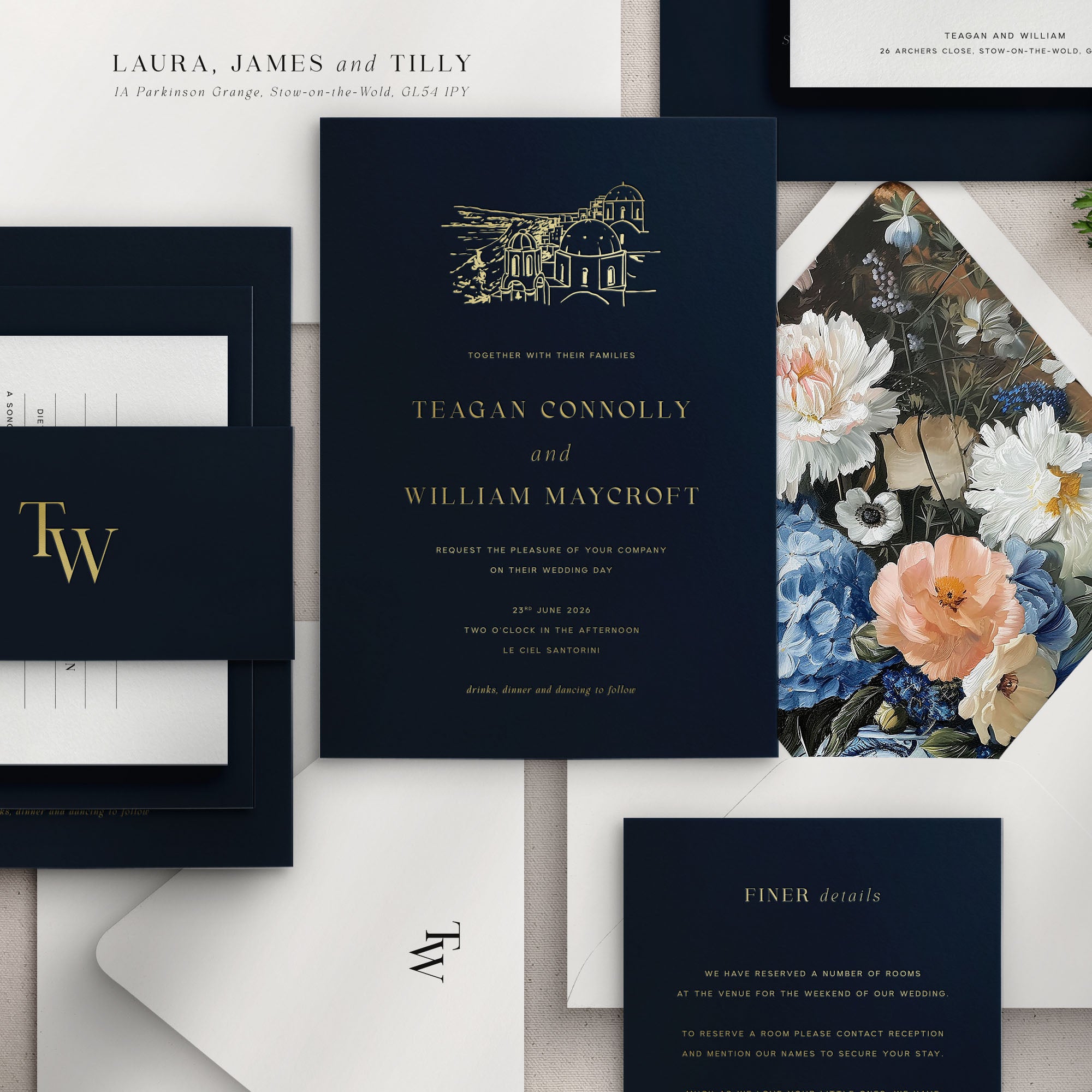 Many couples treat the main invitation as the "hero" piece by having this hot foiled on heavy stock, paired with digitally-printed inserts which also keeps control of your wedding stationery budget without losing impact.