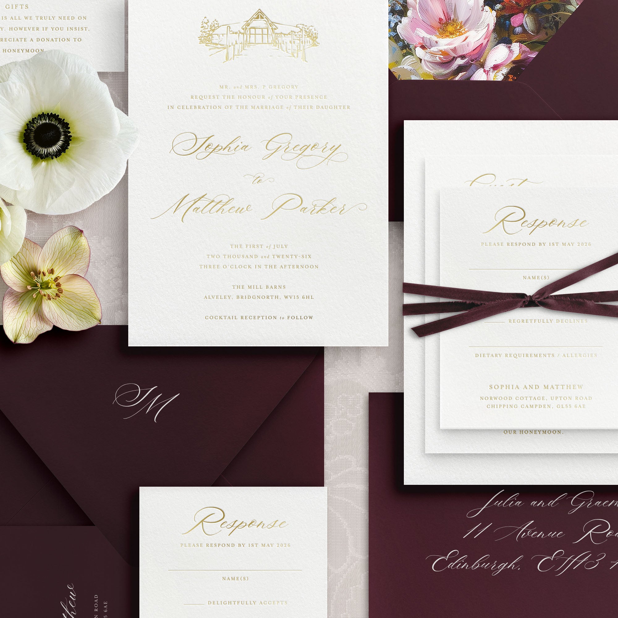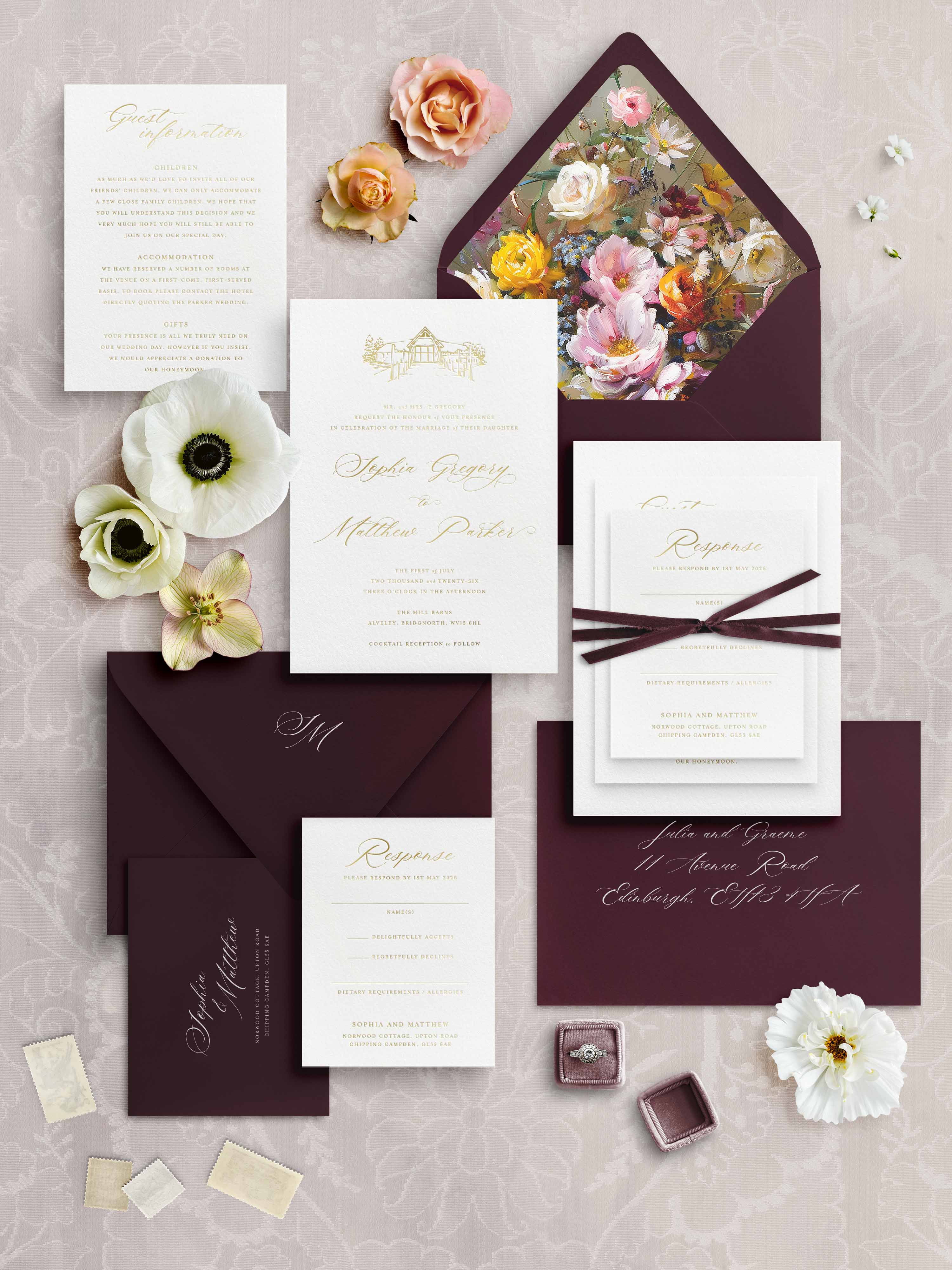 Many couples treat the main invitation as the "hero" piece by having this hot foiled on heavy stock, paired with digitally-printed inserts which also keeps control of your wedding stationery budget without losing impact.