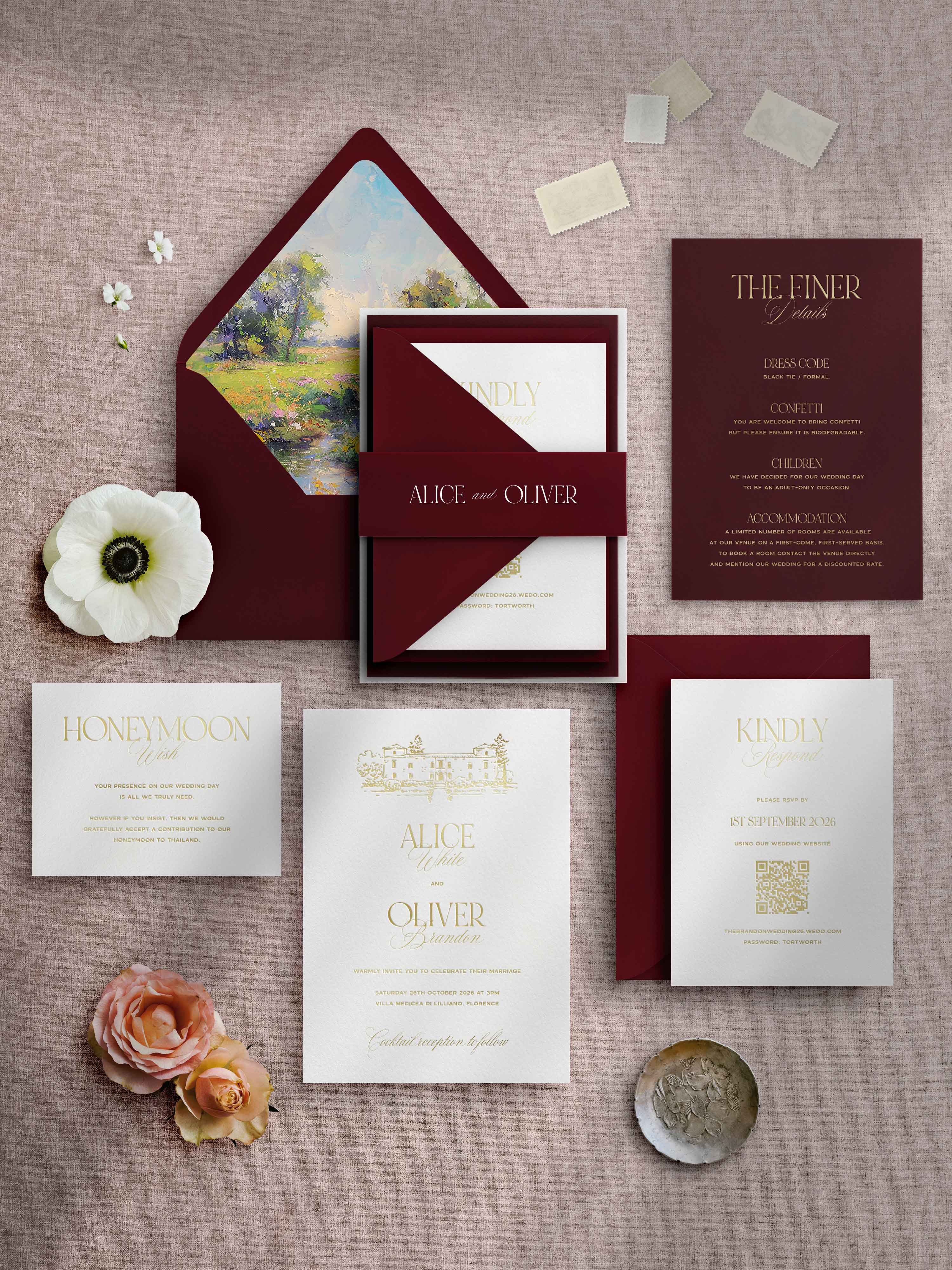 Additional advice would be to keep information concise where you can and, if possible, use a wedding website for a lot of your long-form, conversational wording. This can ensure you can put more of your budget into the styling of your invitations.