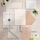 Hot foiling invitations is very flexible and can be used in a number of ways. You can opt to have full foiling for all pieces, foil only specific elements such as your names or monogram for impact, add blind debossing or embossing, and so on.