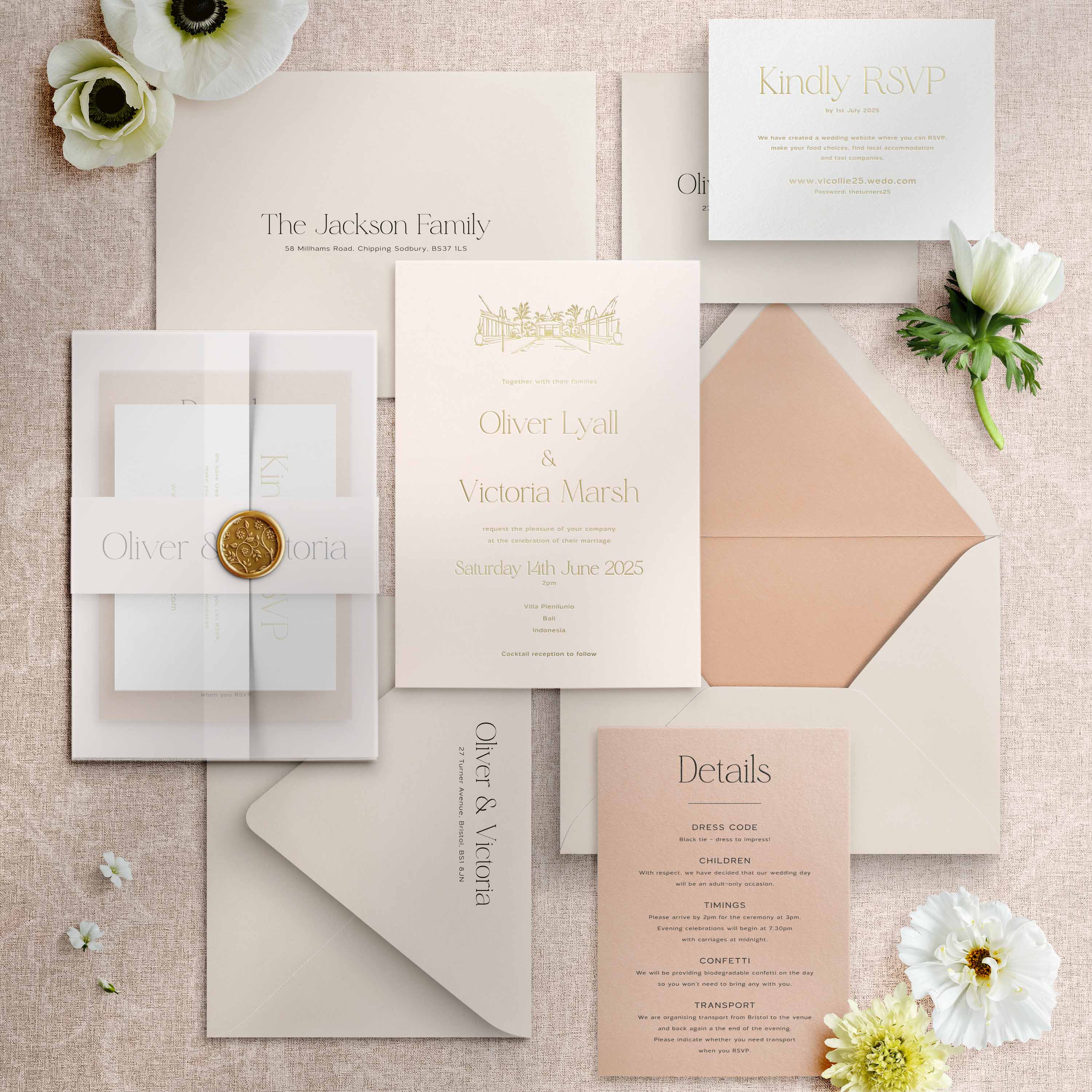 You can opt for your invitation pieces to be provided only or combine with a number of styling options from paper belly bands, plain or printed vellum jackets and handmade wax seals all available to add an extra touch of luxury.