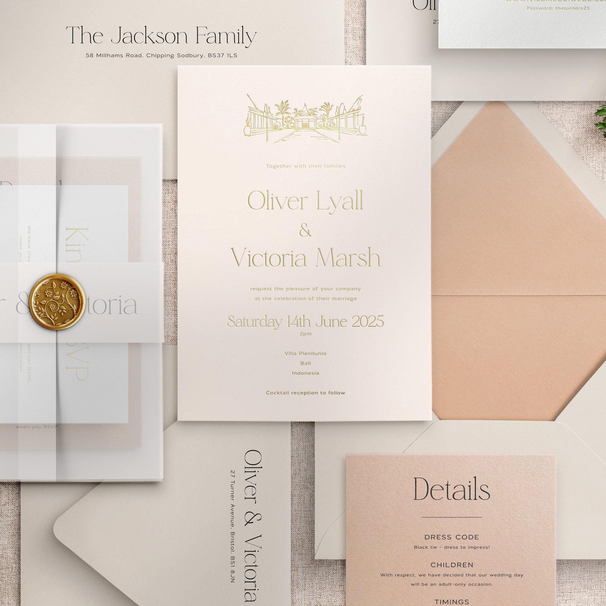 Many couples treat the main invitation as the "hero" piece by having this hot foiled on heavy stock, paired with digitally-printed inserts which also keeps control of your wedding stationery budget without losing impact.