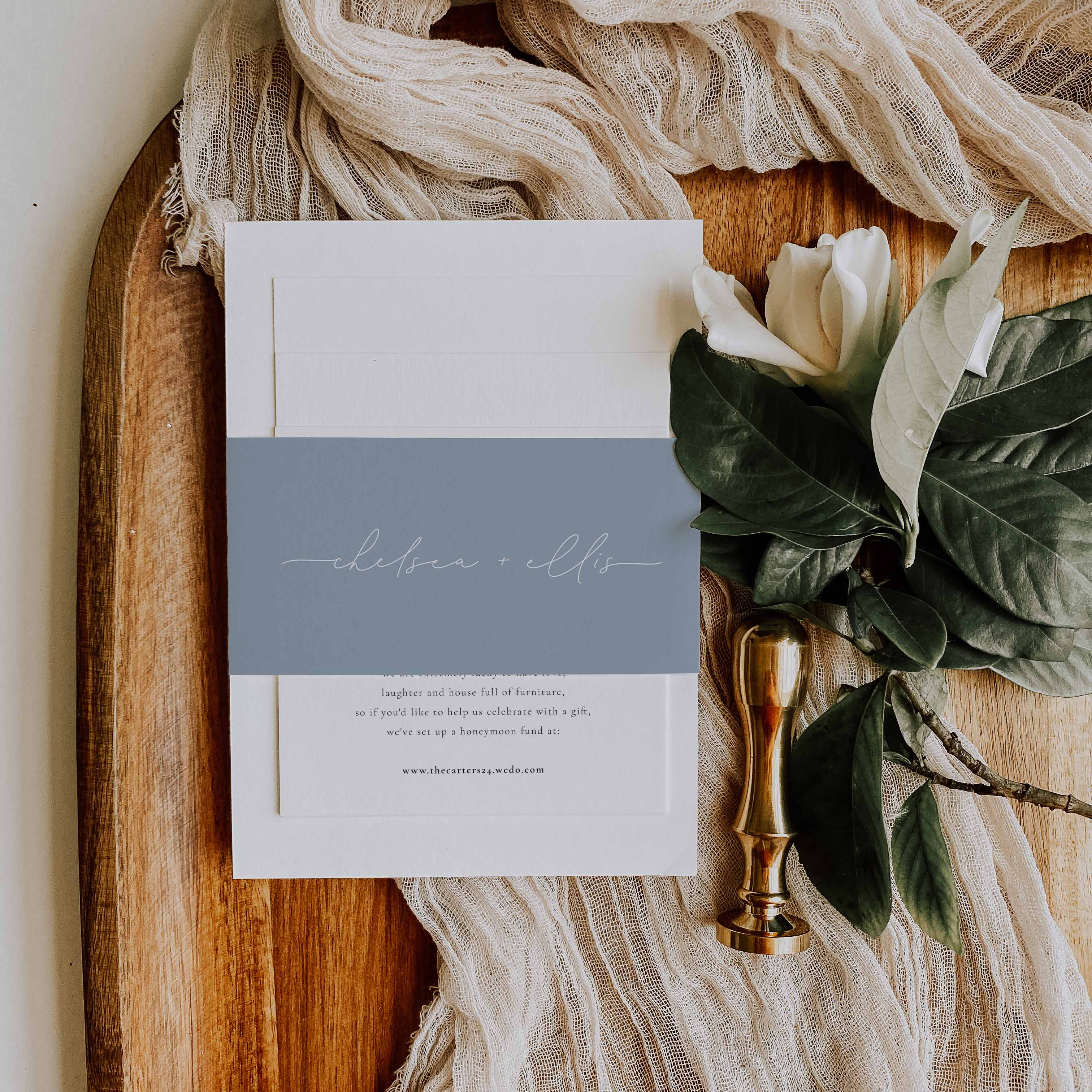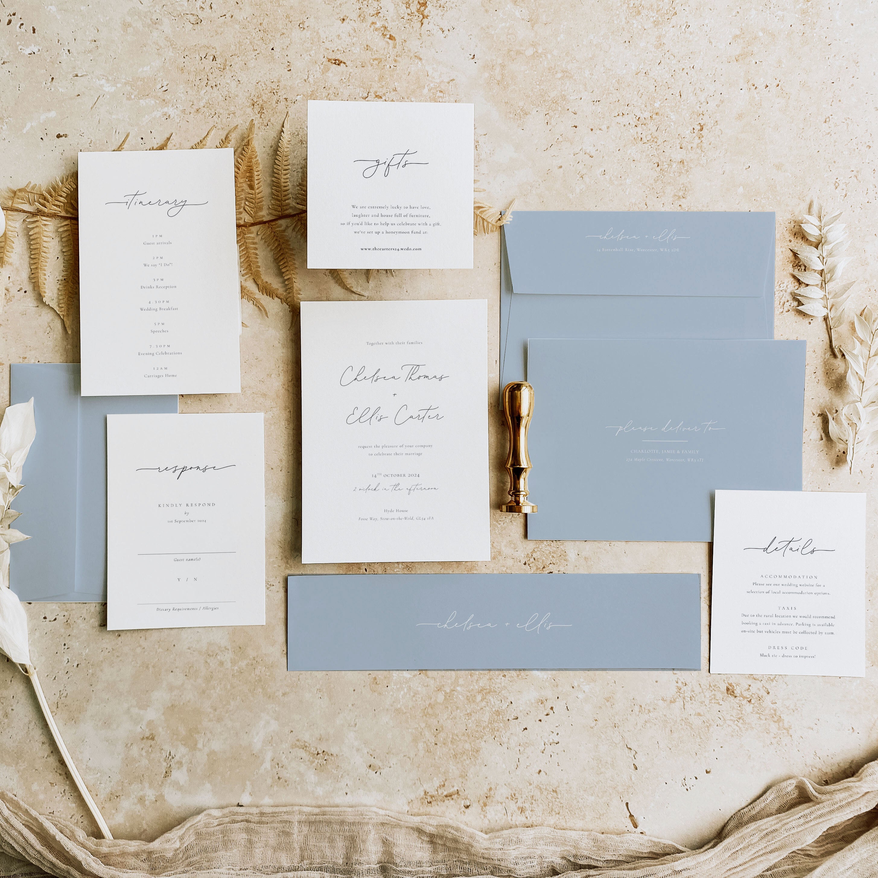 - Additional styling options available, such as belly bands, vellum jackets, wax seals, coloured envelopes and liners, plus envelope addressing and guest name printing.