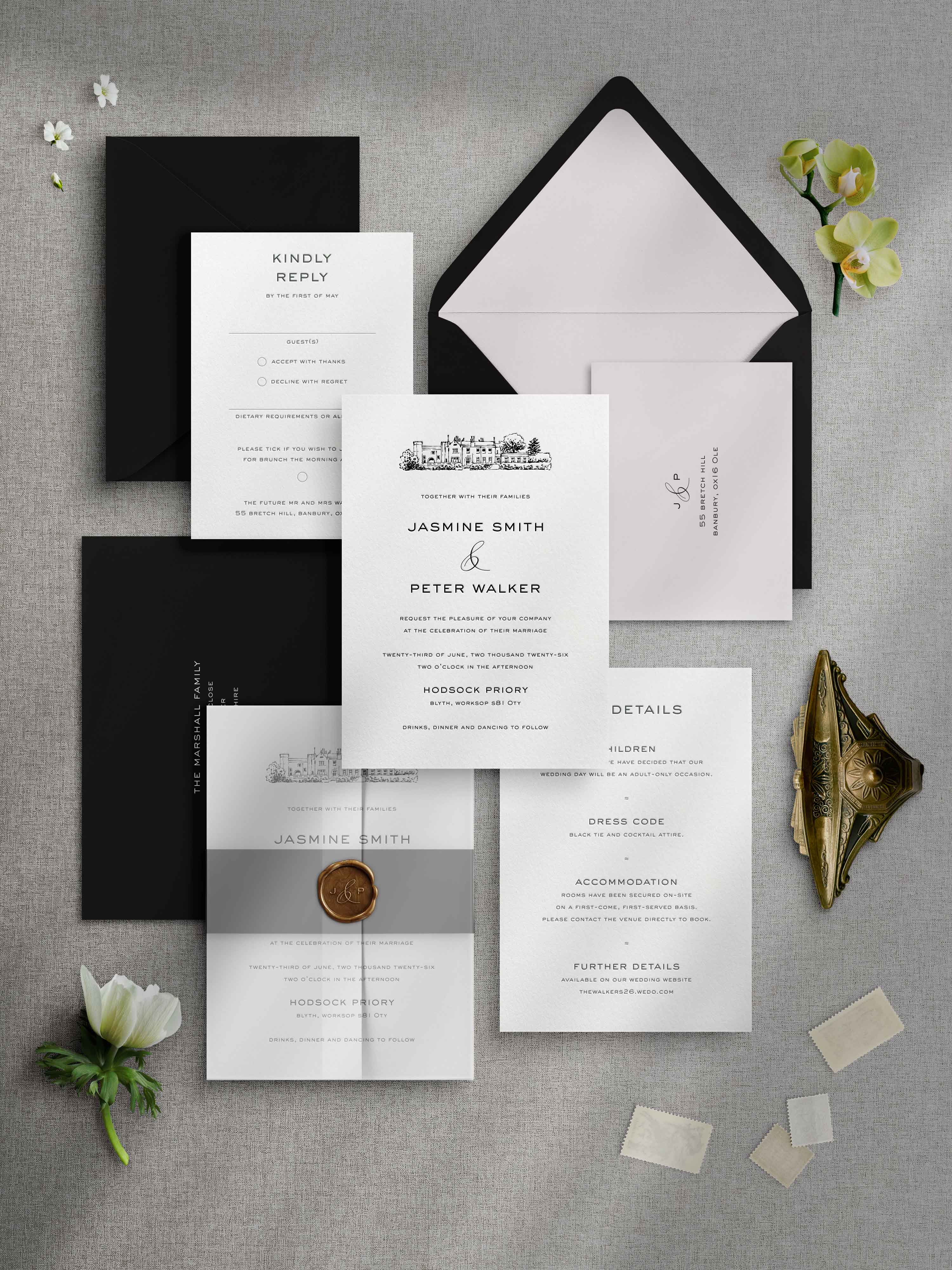 You can opt for your invitation pieces to be provided only or combine with a number of styling options from paper belly bands, plain or printed vellum jackets and handmade wax seals all available to add an extra touch of luxury.