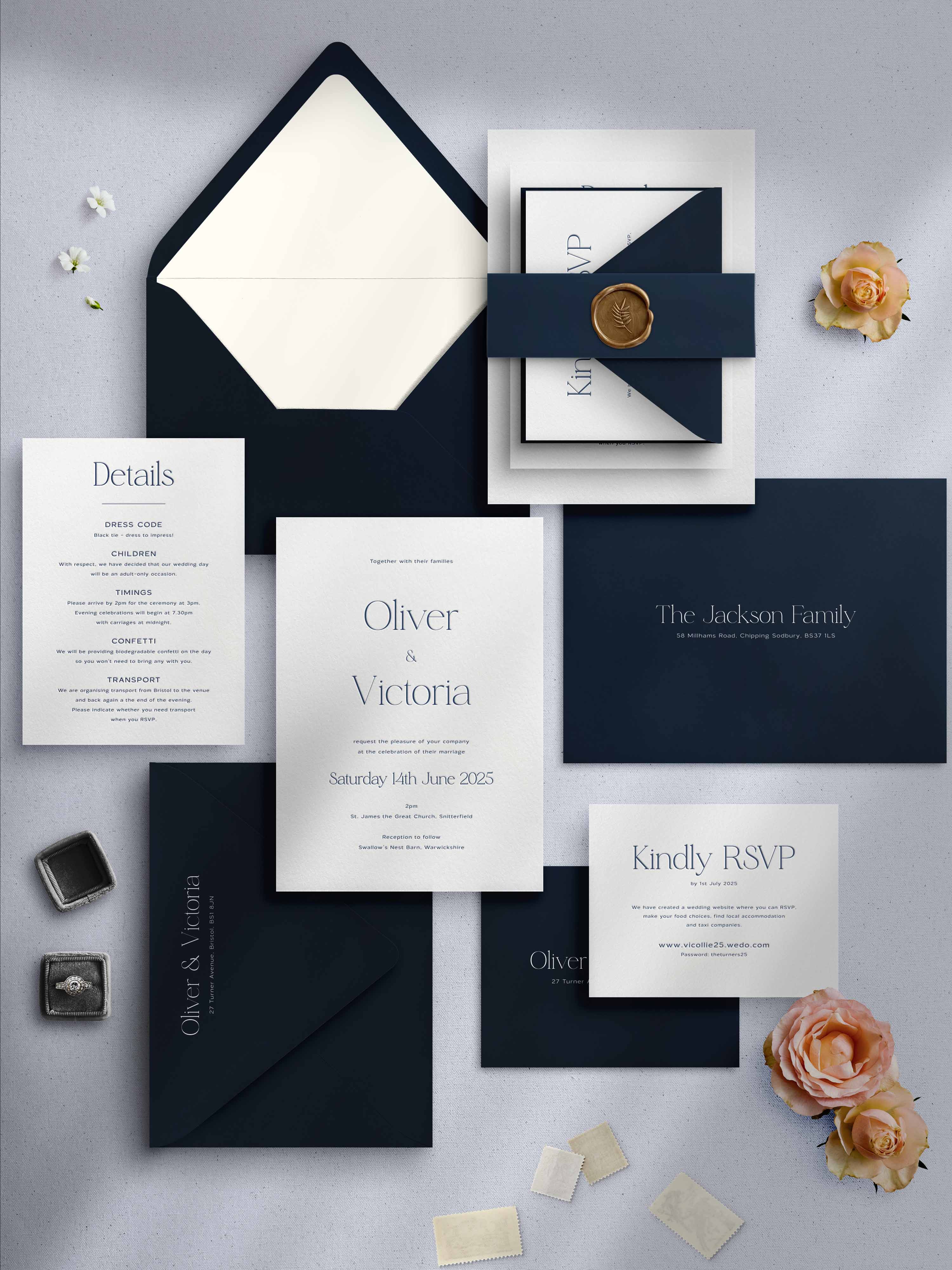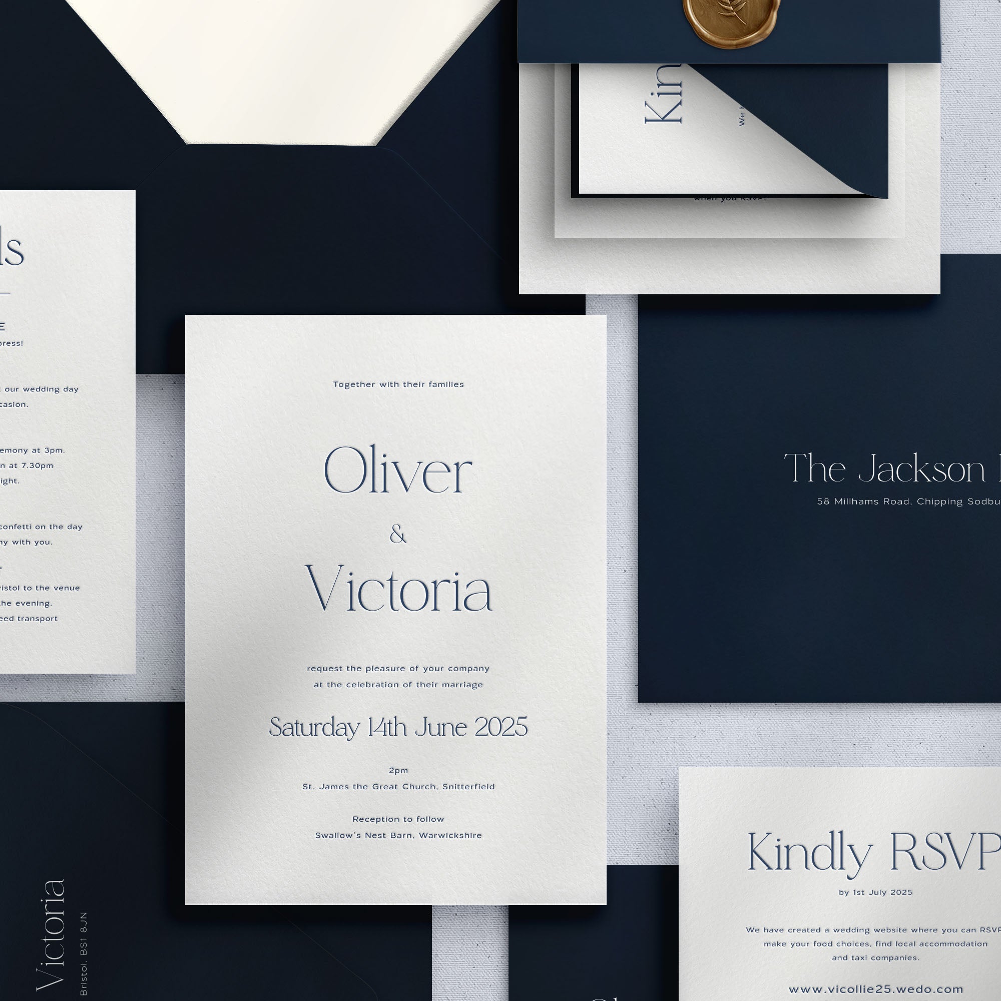 Sometimes less is more and with our Victoria collection, an understated style creates a spacious and refined design for this handcrafted letterpress invitation suite.