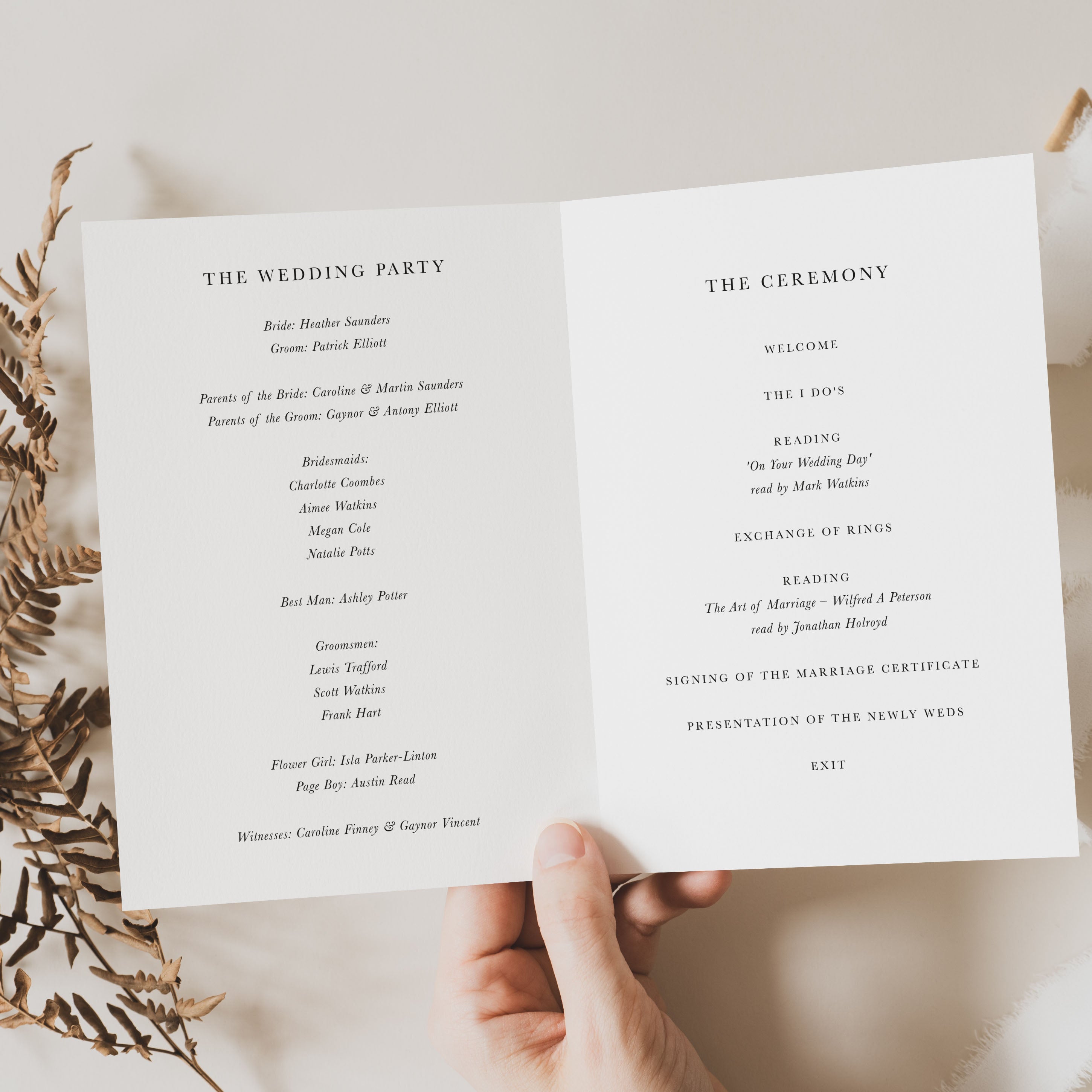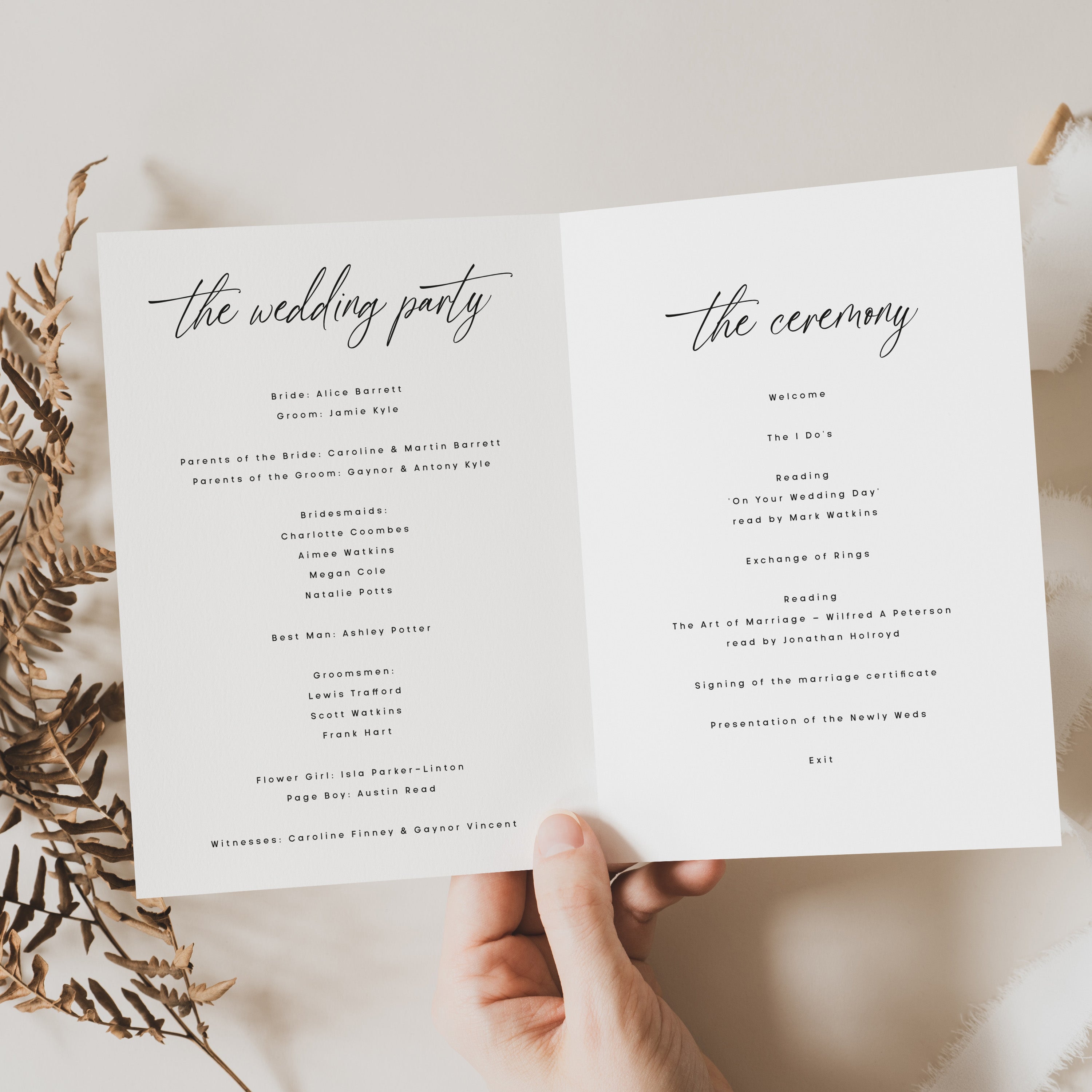 The Order of Service - also sometimes referred to as a Wedding Programme, especially in the States - typically accompanies the ceremony so that guests can follow proceedings, join in with hymns, and give their blessings.