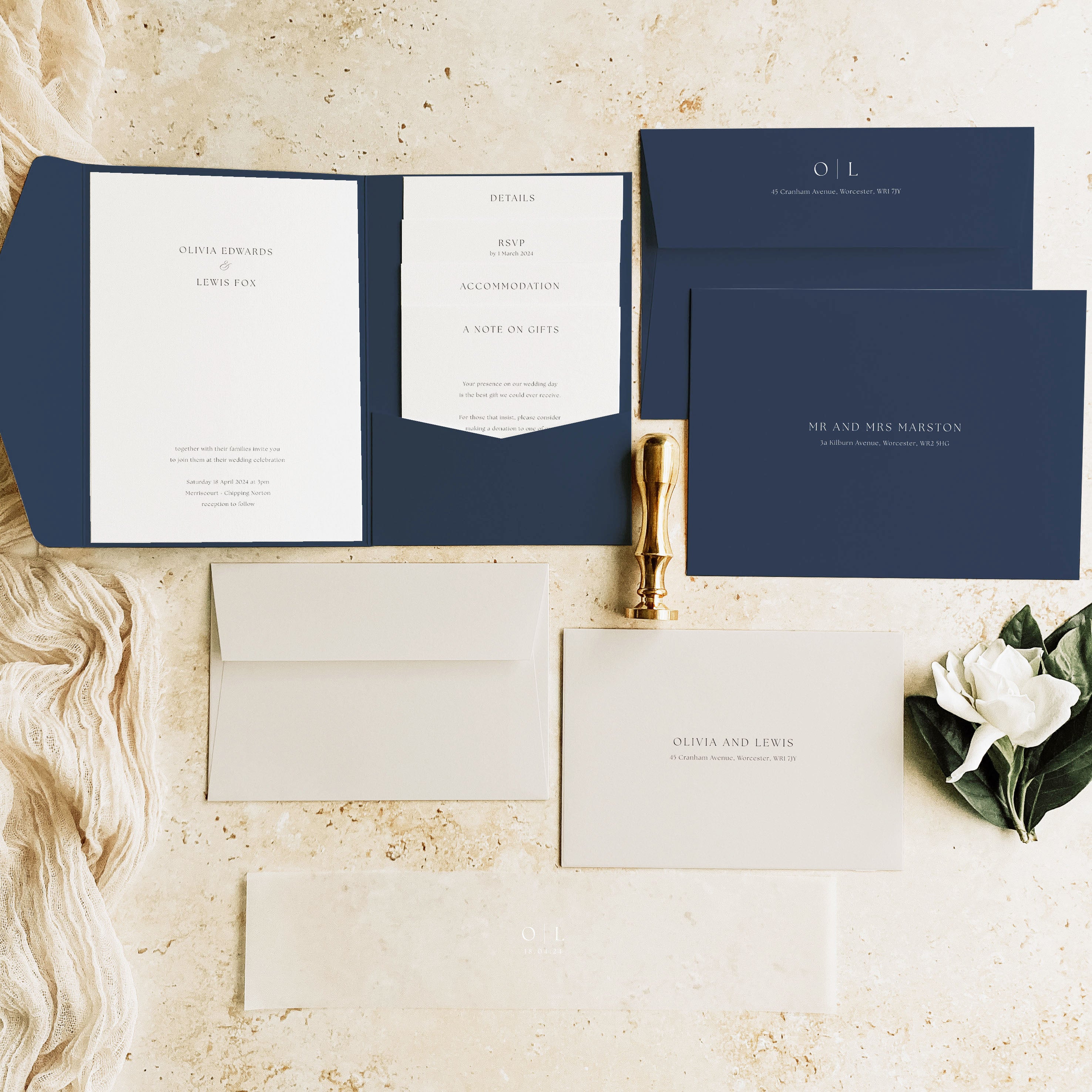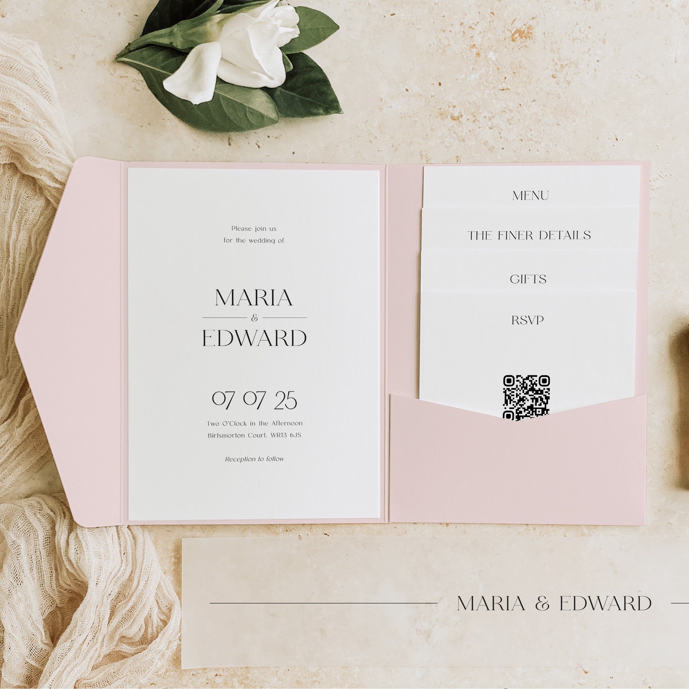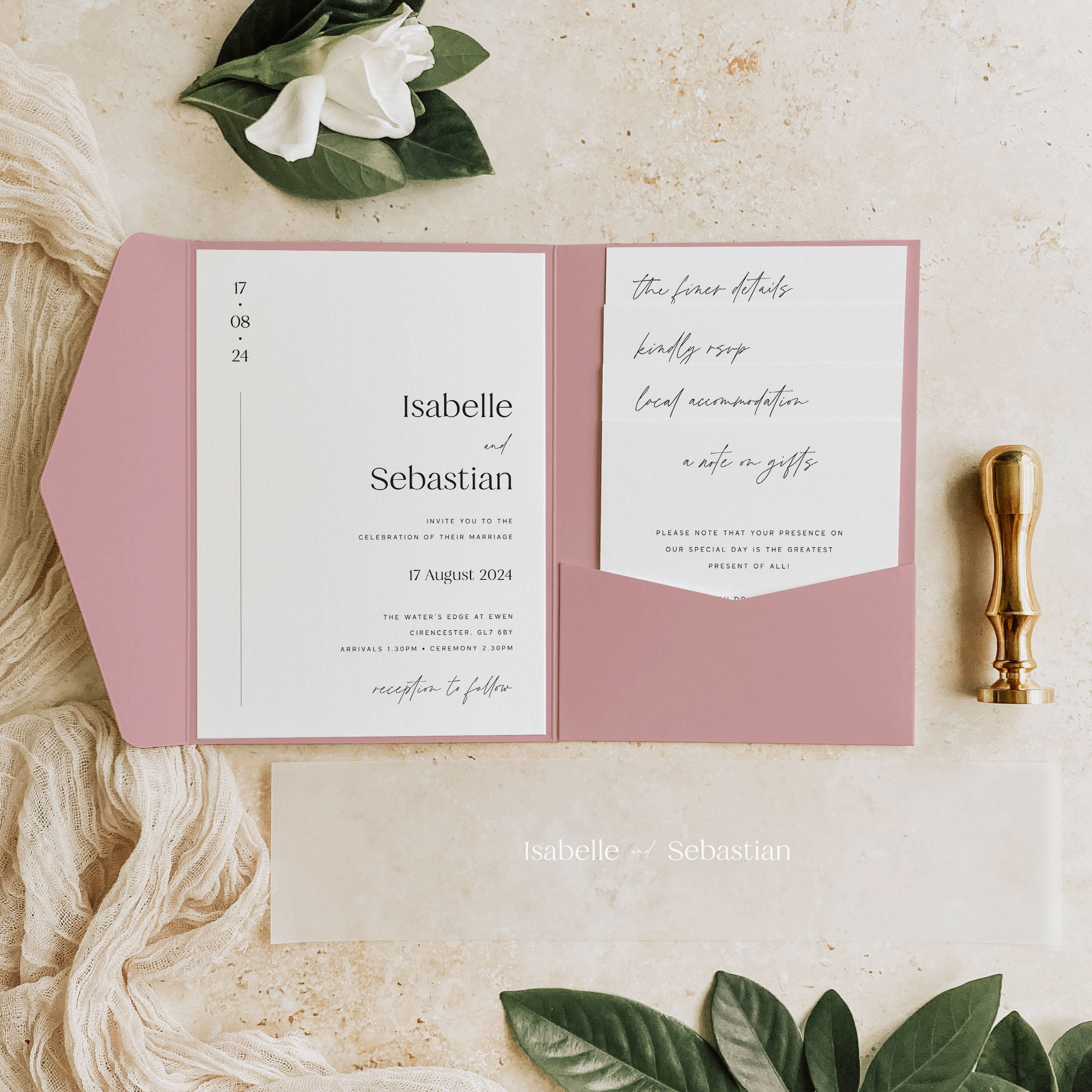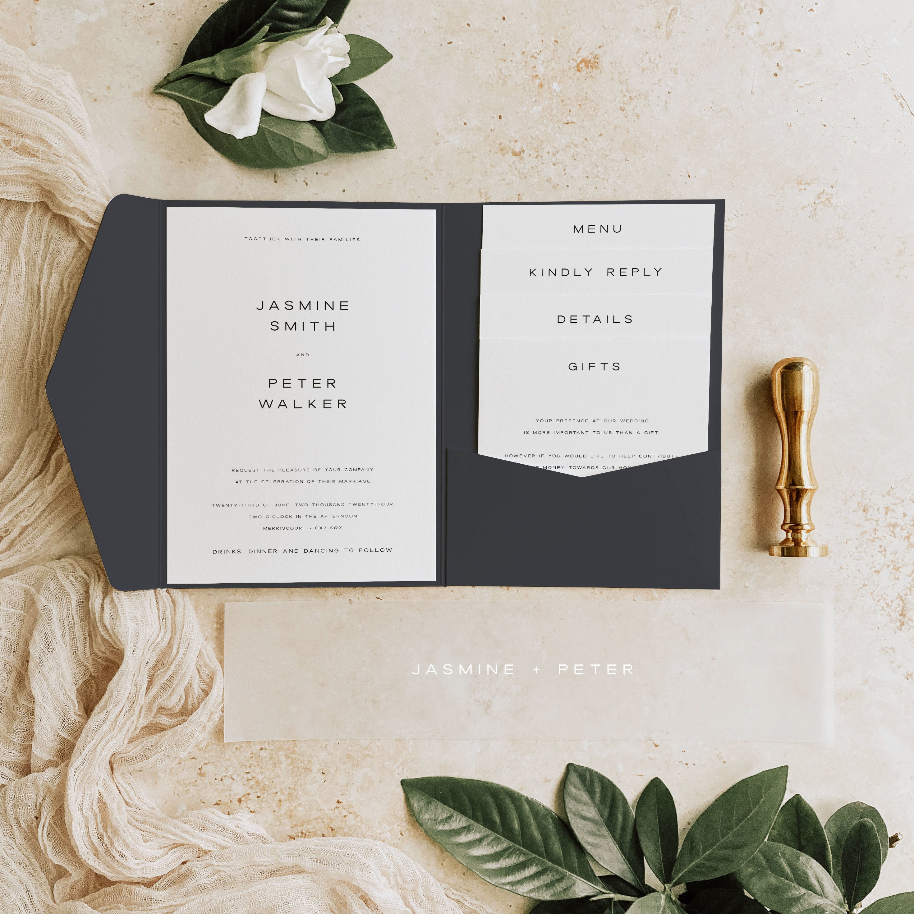 Our pocketfold designs are contemporary but in a traditional format, so perfect for those that want to have a neat invitation package with all of your additional information tucked into the pocket inside.