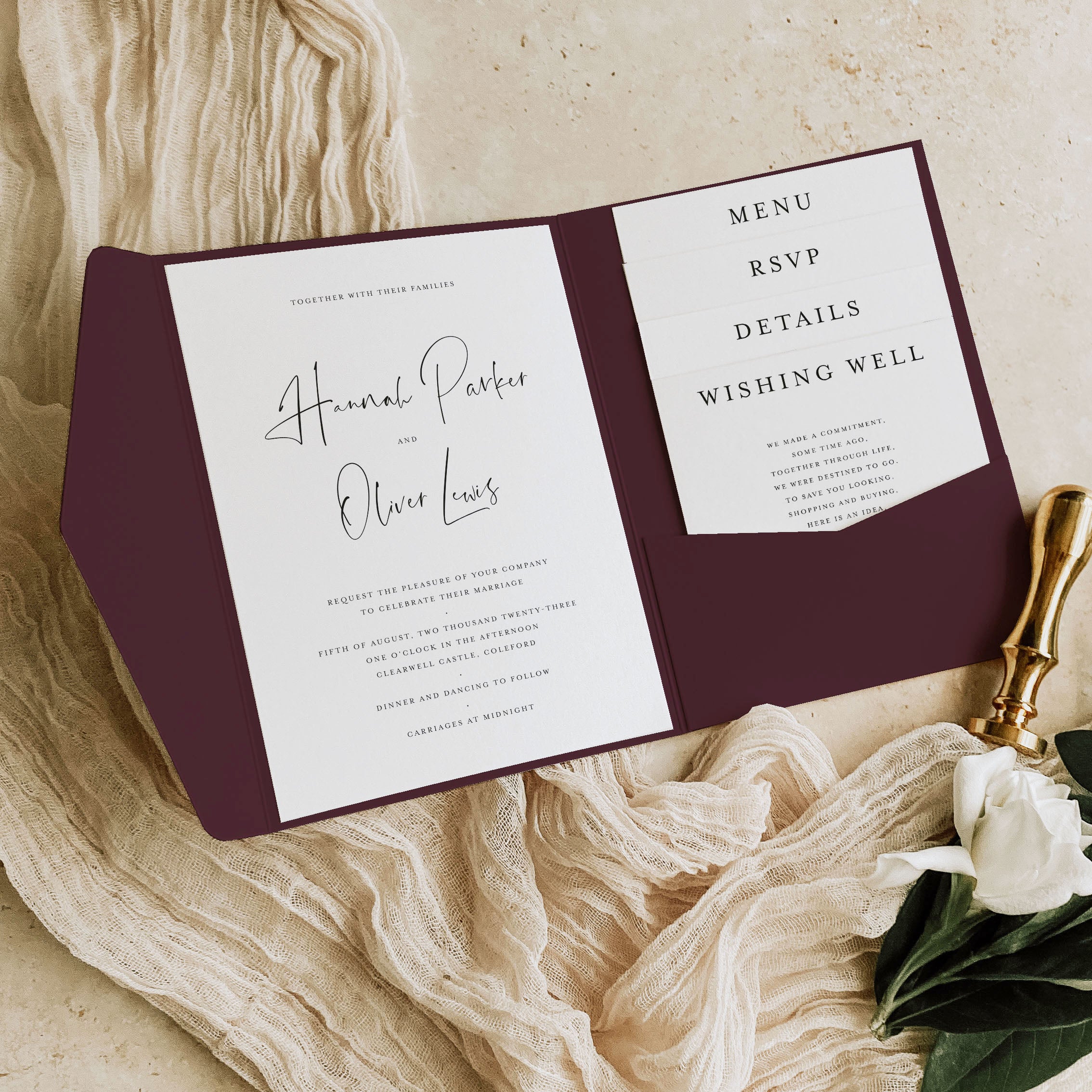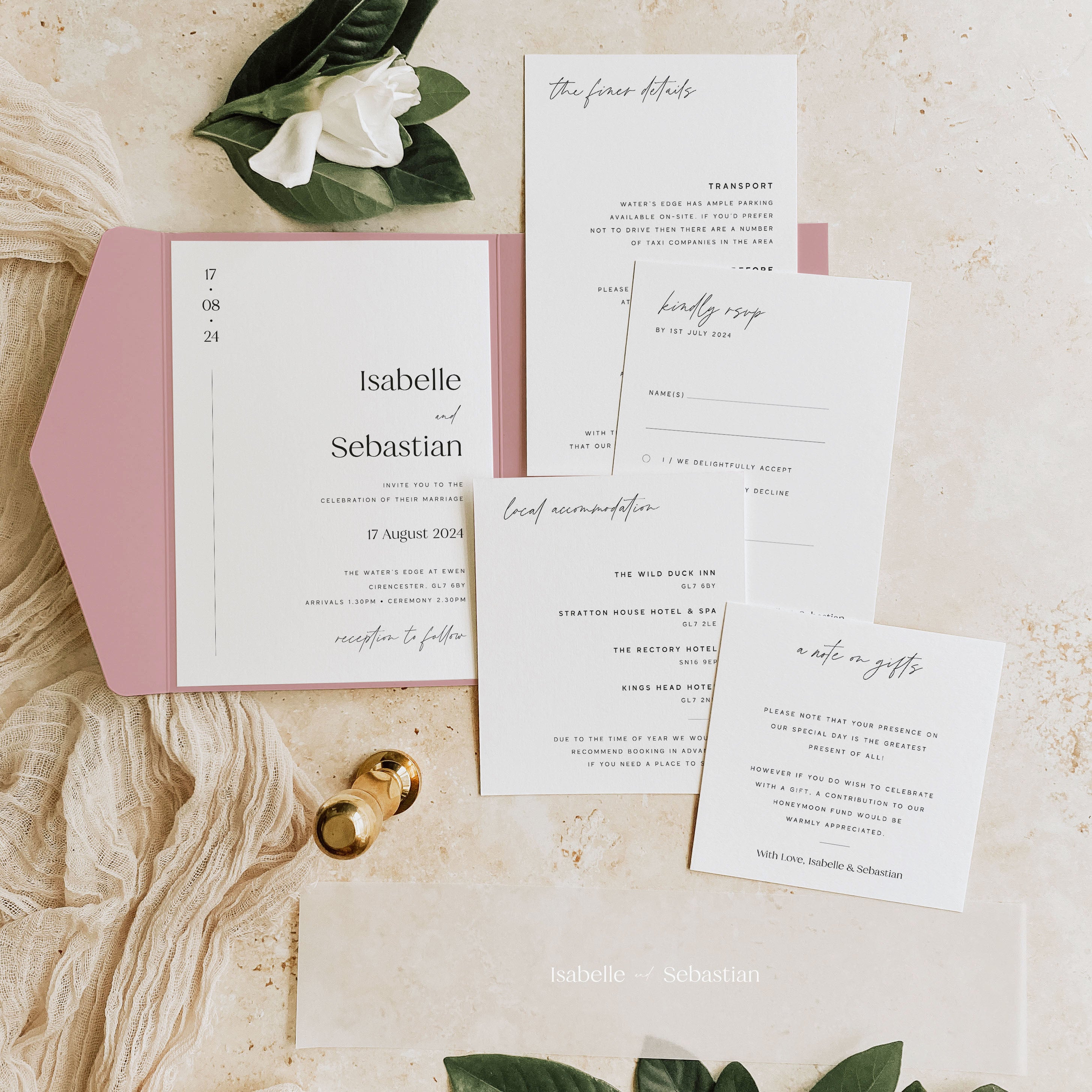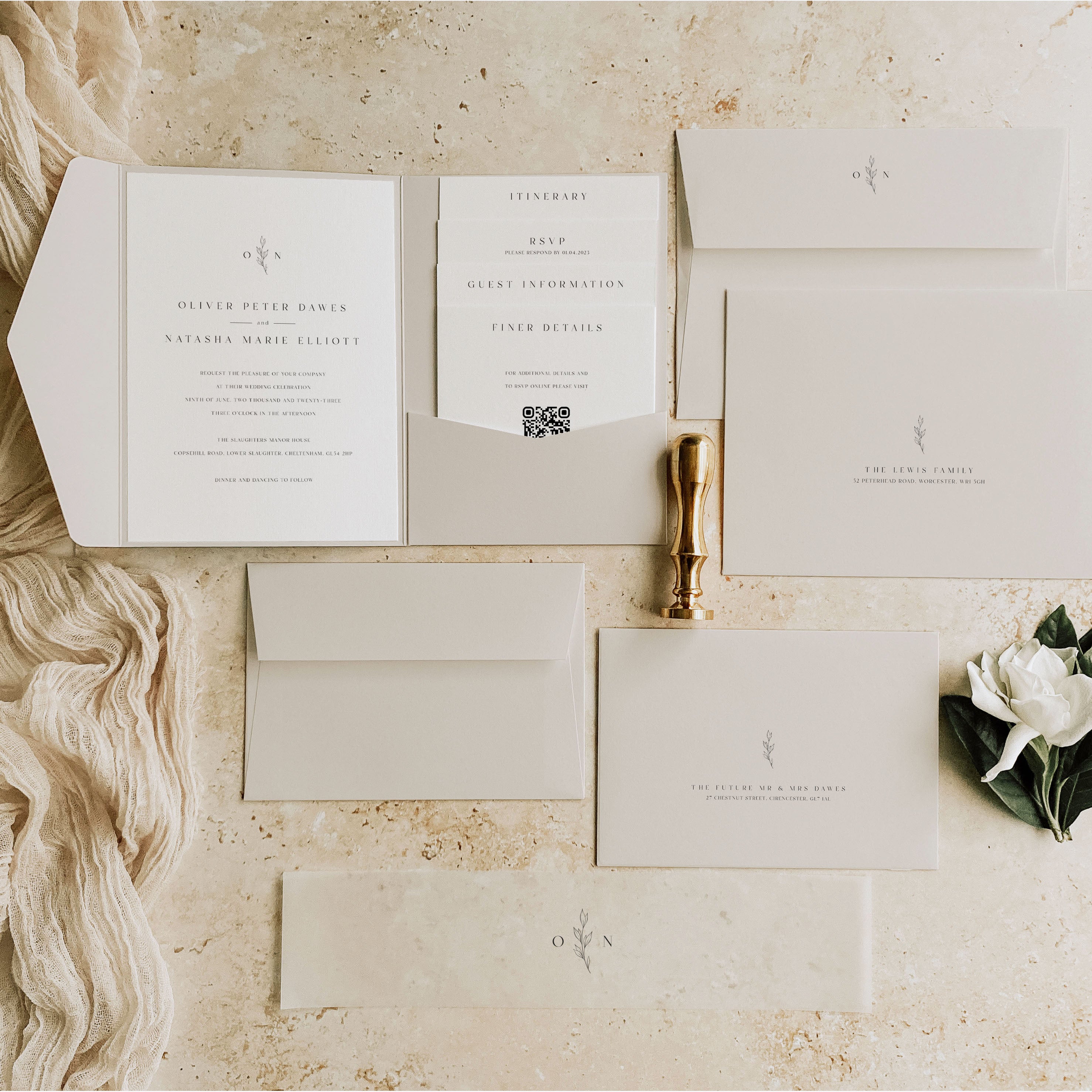 Our pocketfold designs are contemporary but in a traditional format, so perfect for those that want to have a neat invitation package with all of your additional information tucked into the pocket inside.