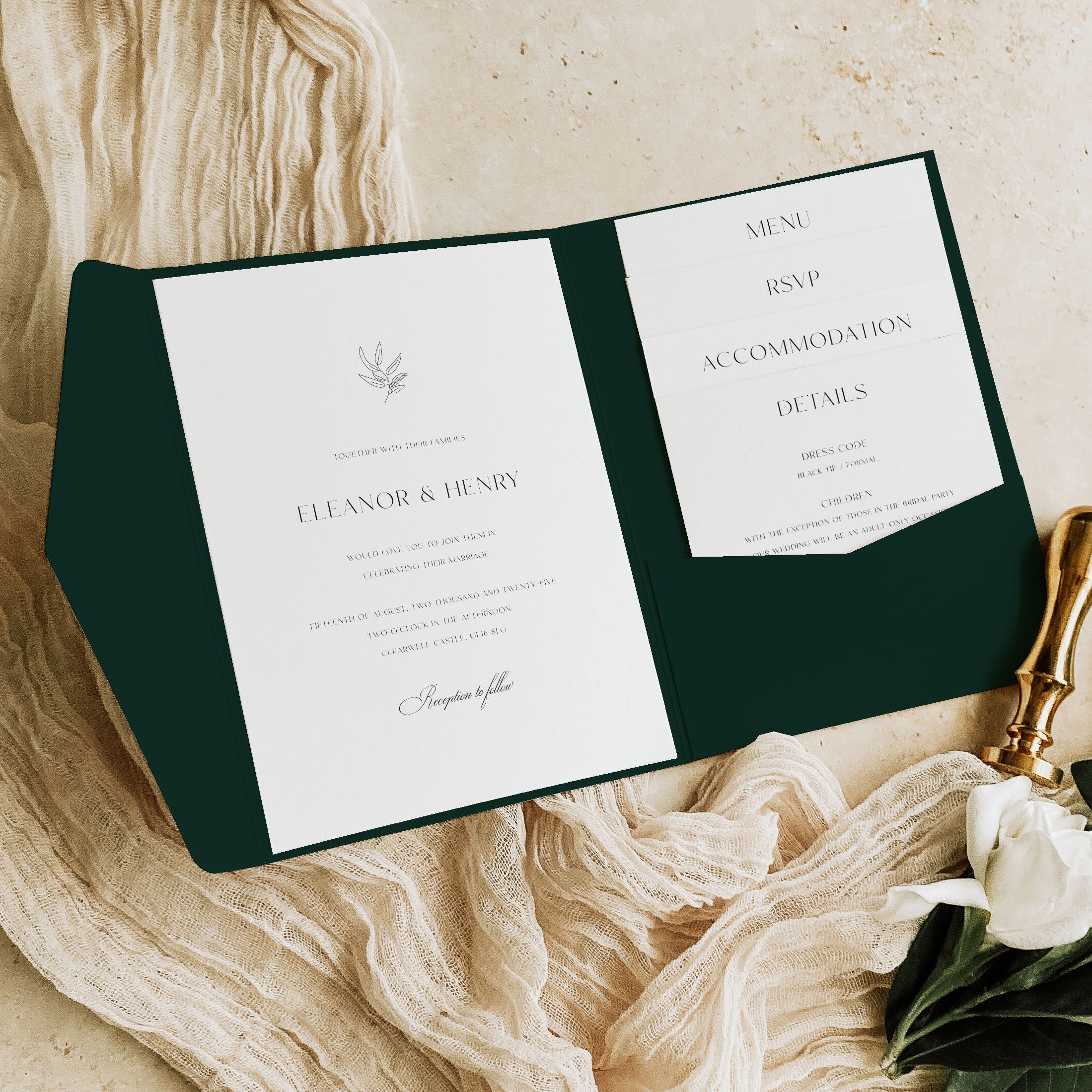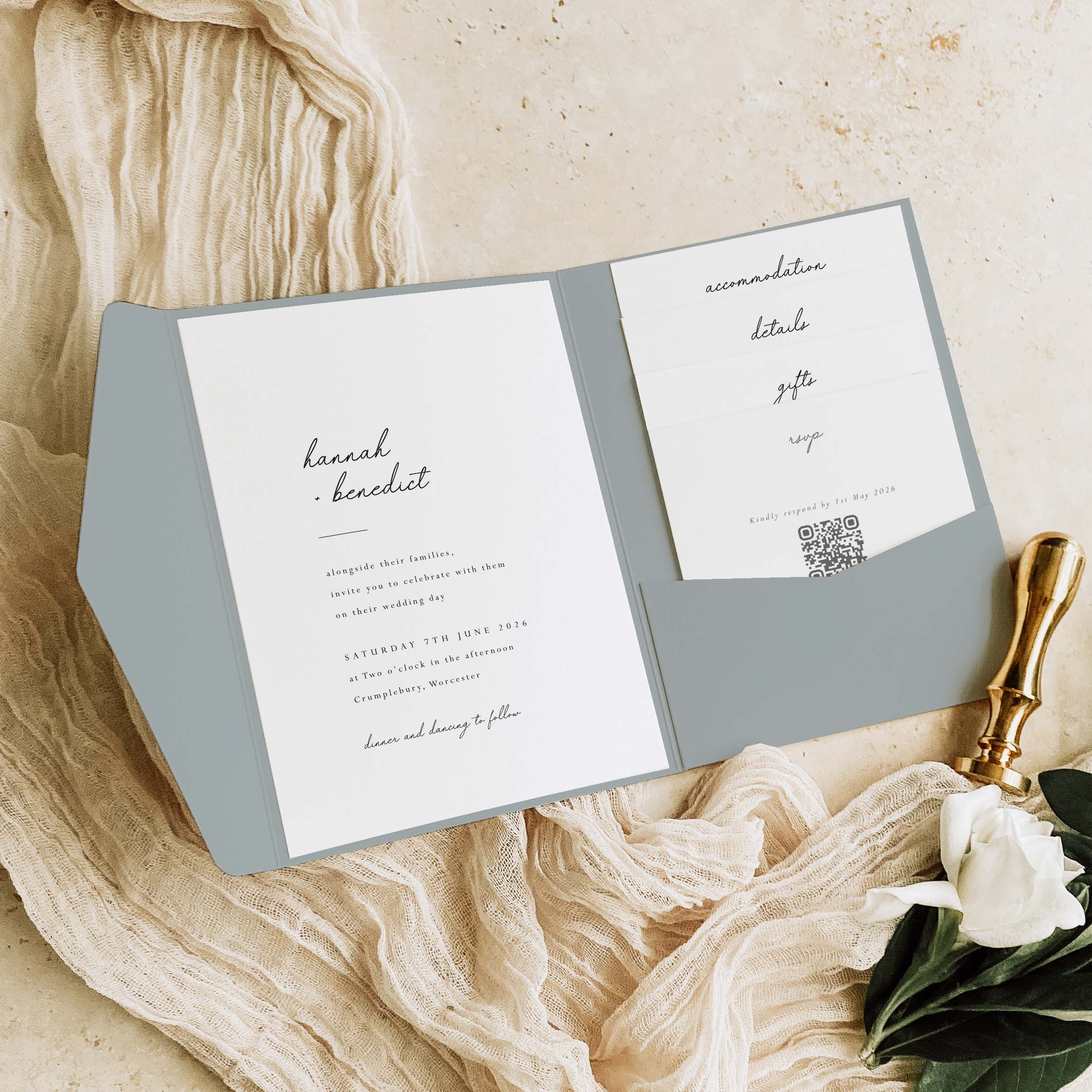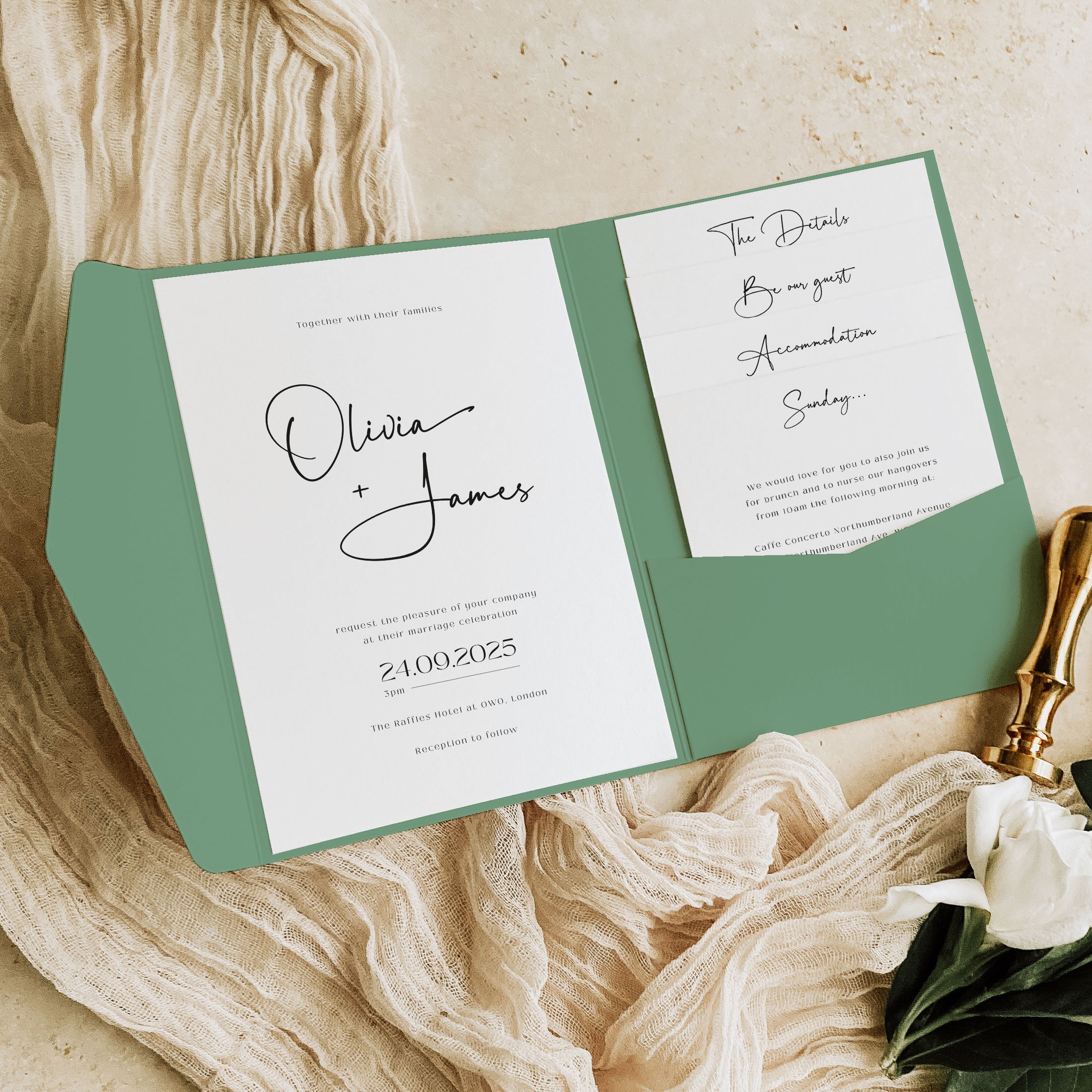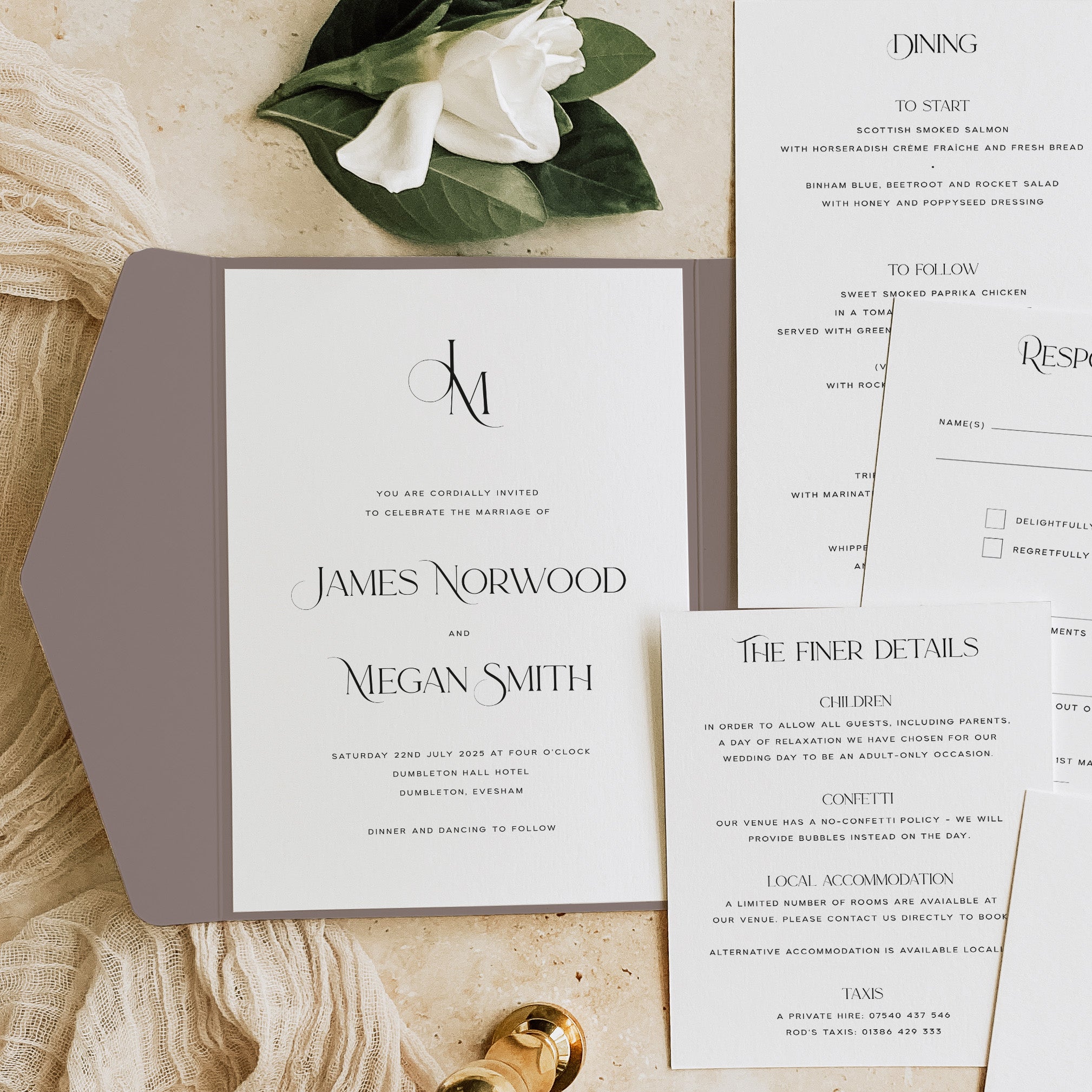 Our pocketfold designs are contemporary but in a traditional format, so perfect for those that want to have a neat invitation package with all of your additional information tucked into the pocket inside.