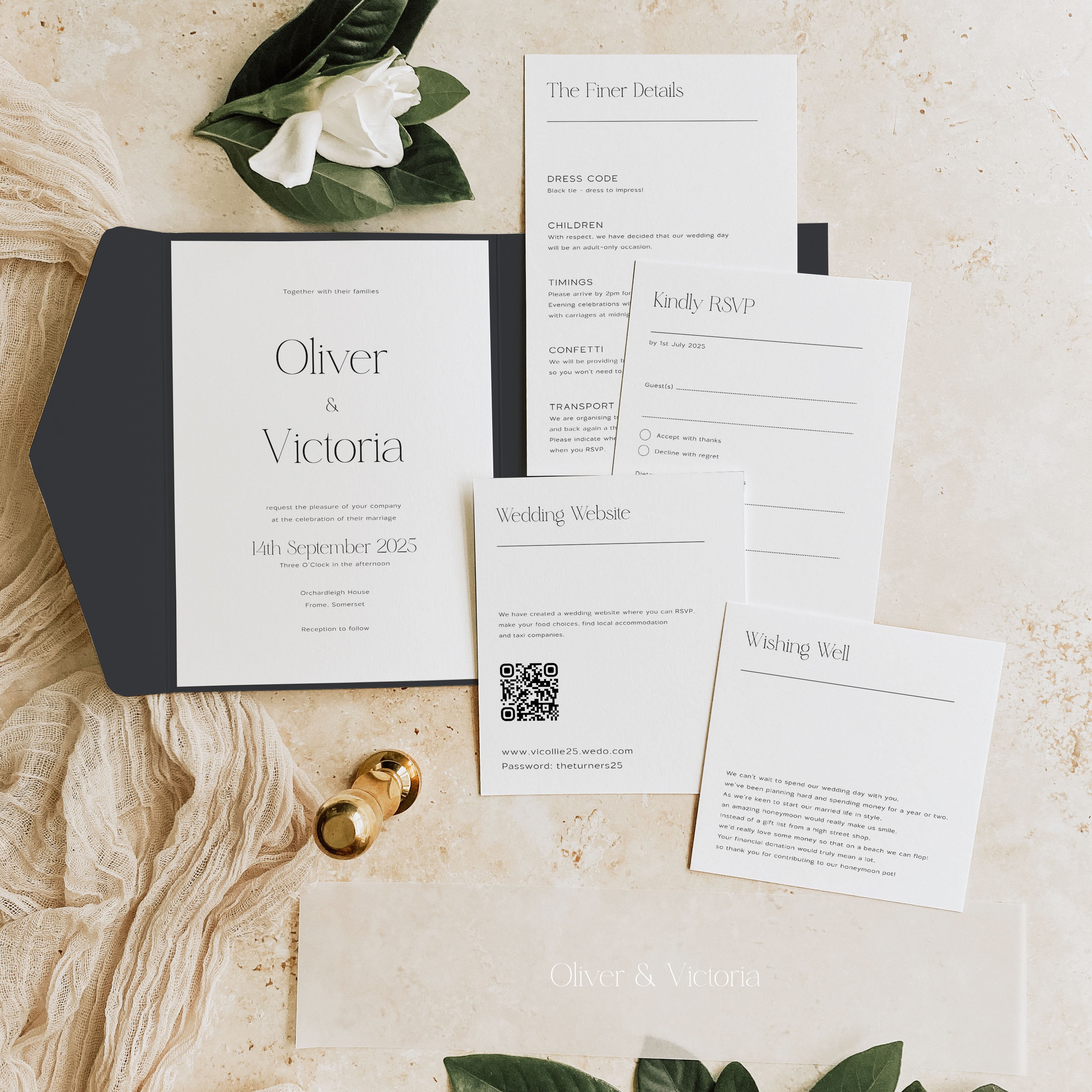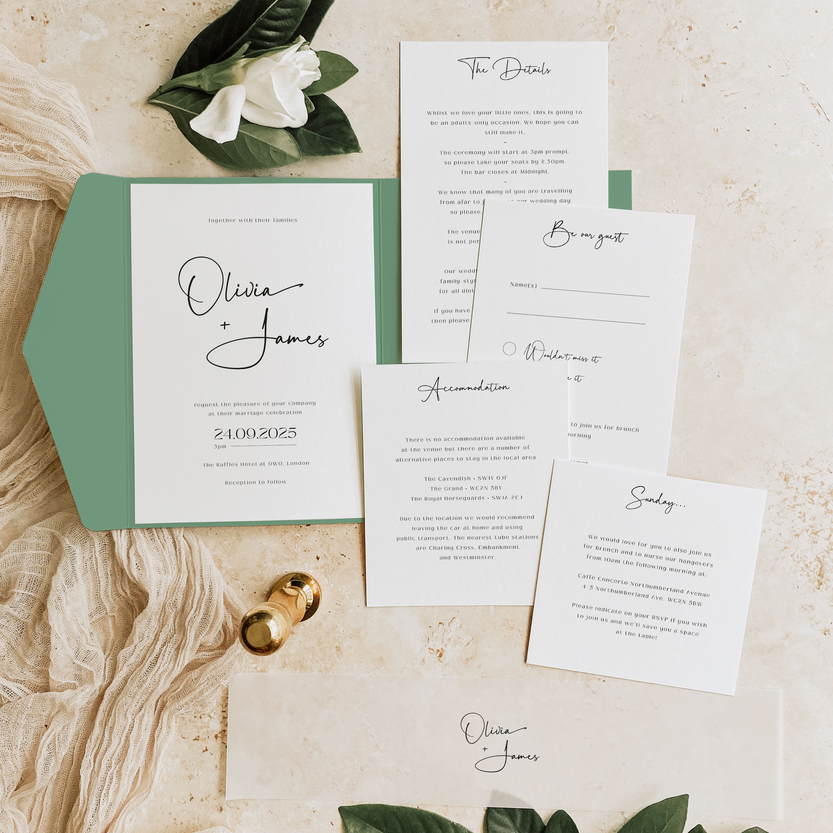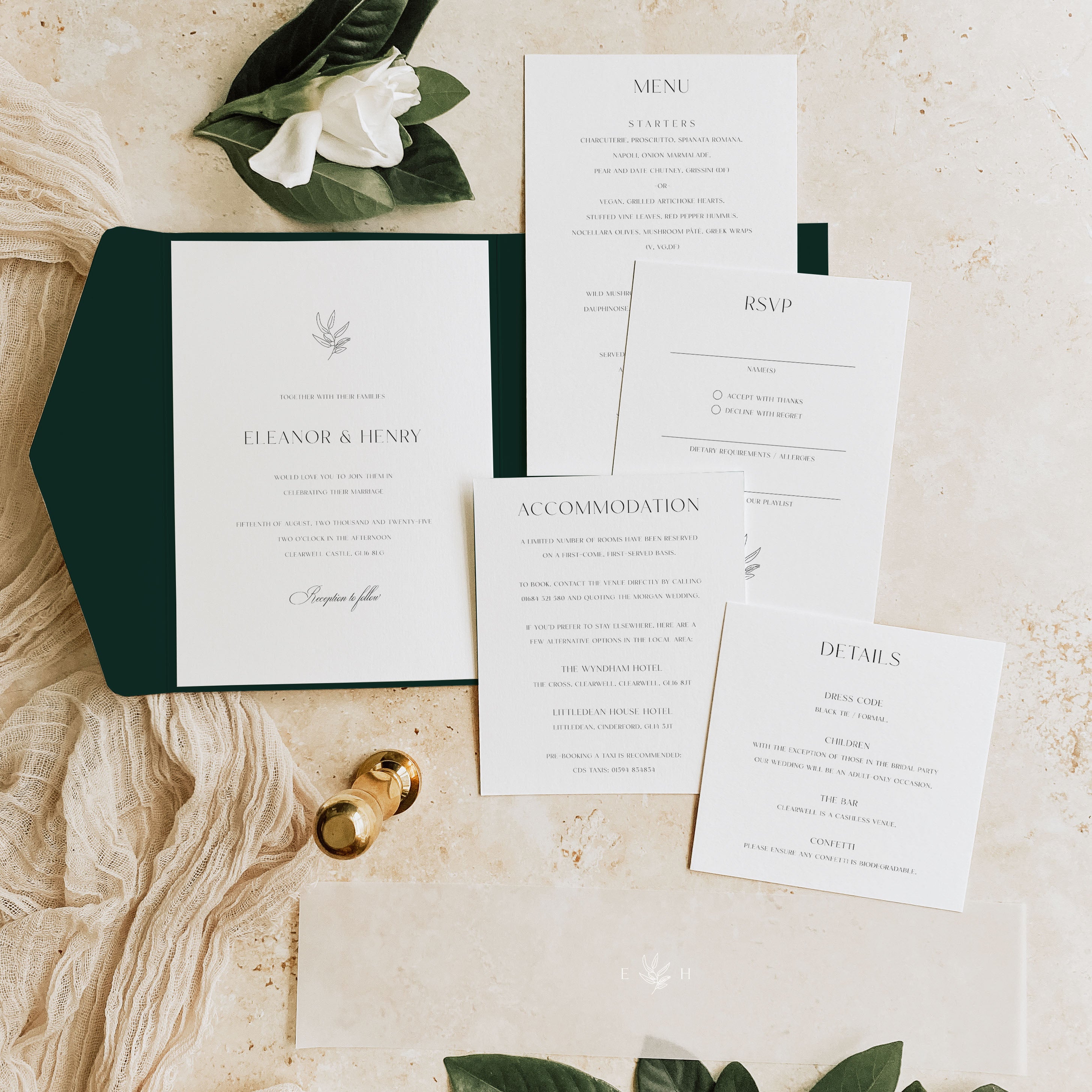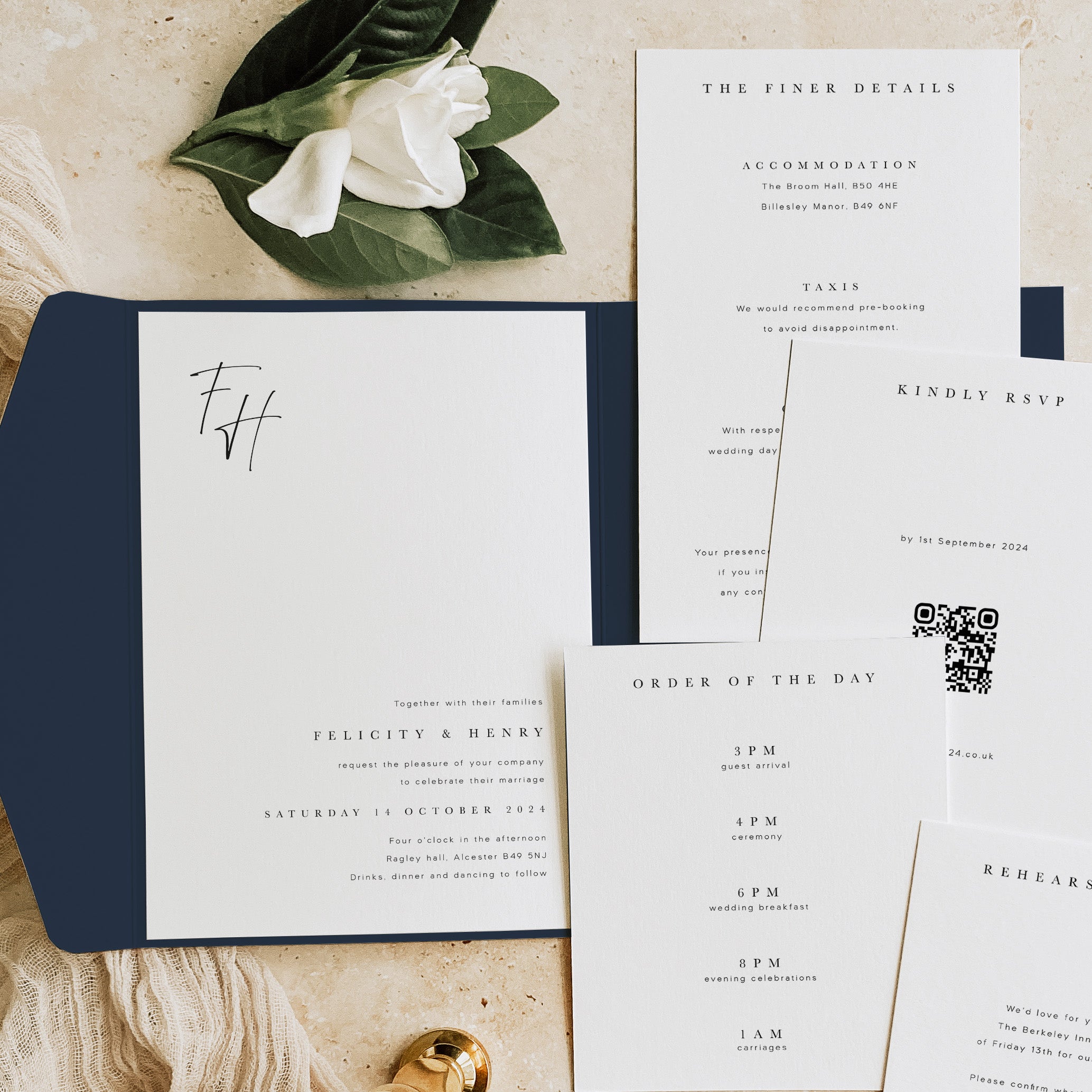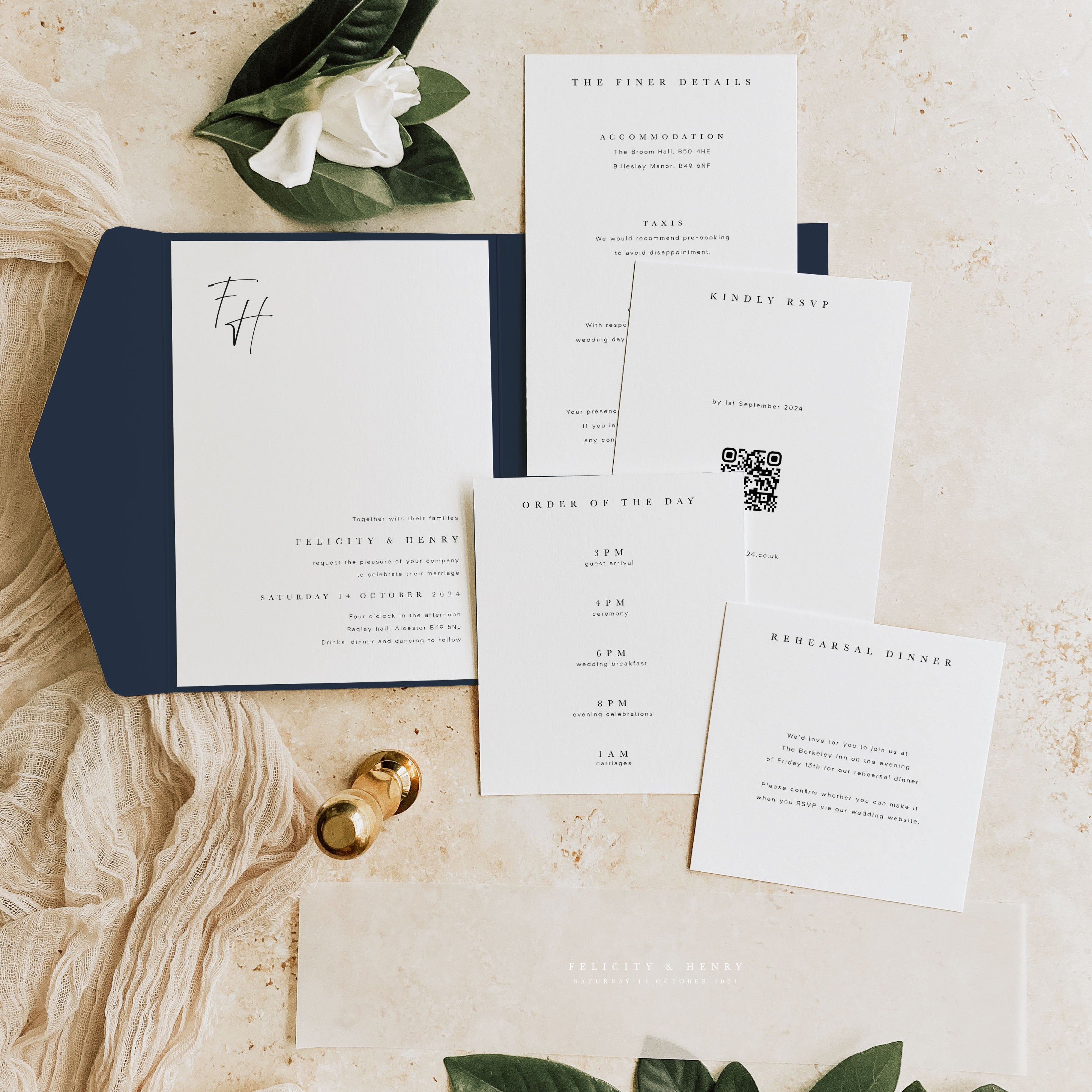 How much information you include with your invitations will depend on your event, as this differs from couple to couple. It’s for this reason that our invitations are versatile, enabling you only to order the pieces that you need. But we do recommend that less is more in most cases.
