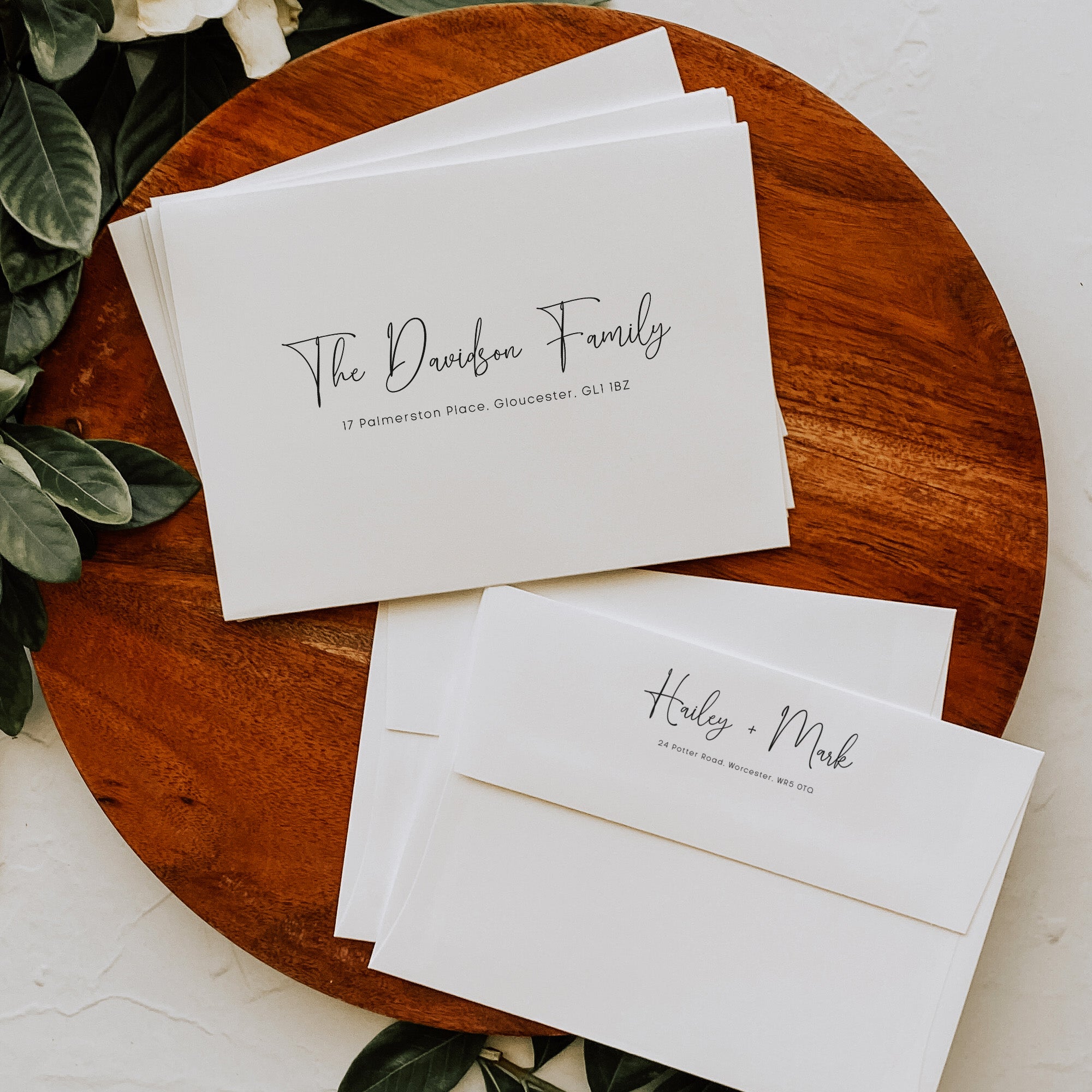 Included in the cost is a high-quality white envelope, with the option of upgrading to a coloured envelope, having the envelopes addressed, adding envelope liners, wax seals, or envelope stickers.