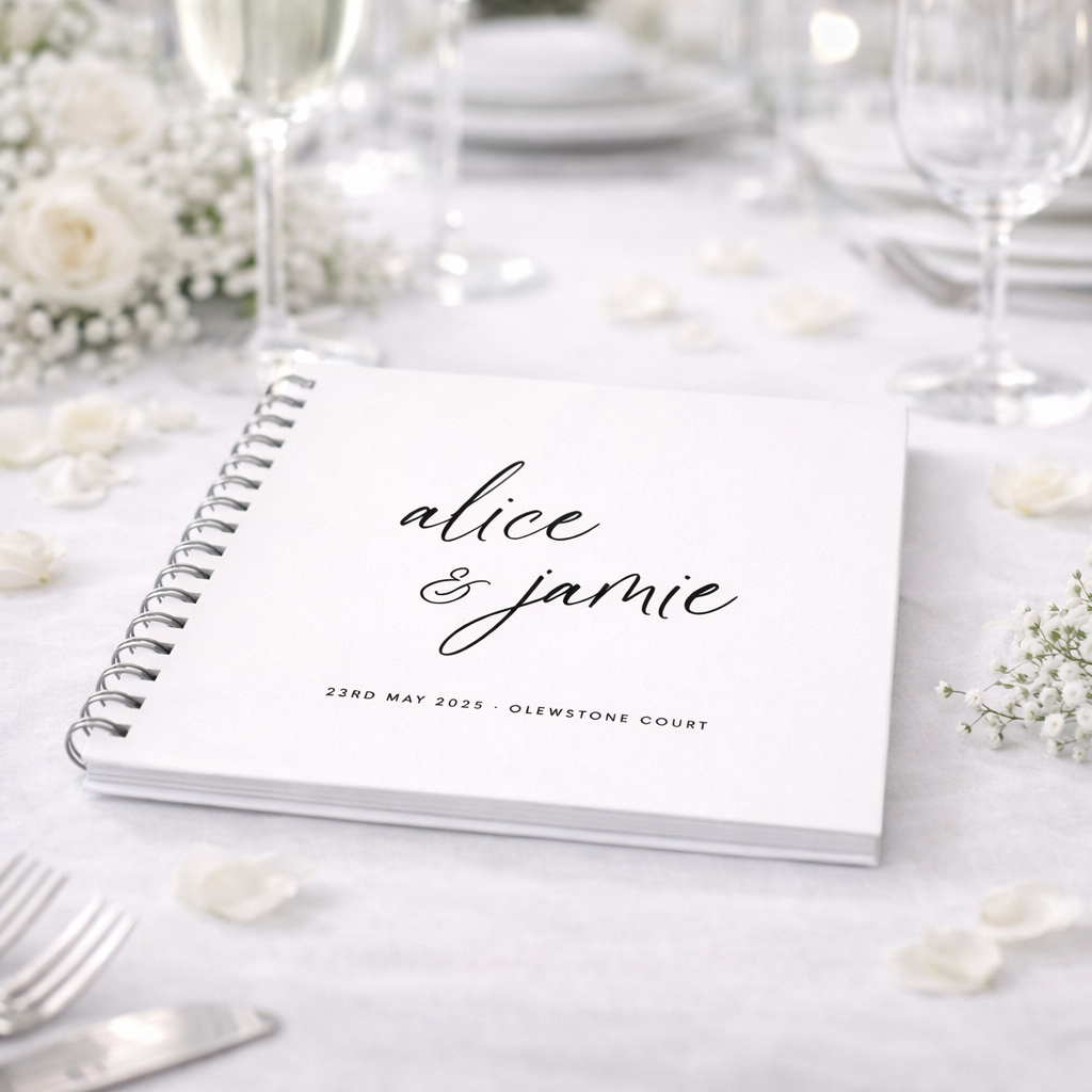 A guest book cover can have the names of the couple, wedding date and wedding venue, along with any custom wording if required.