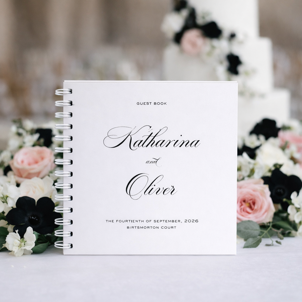 A guest book cover can have the names of the couple, wedding date and wedding venue, along with any custom wording if required.