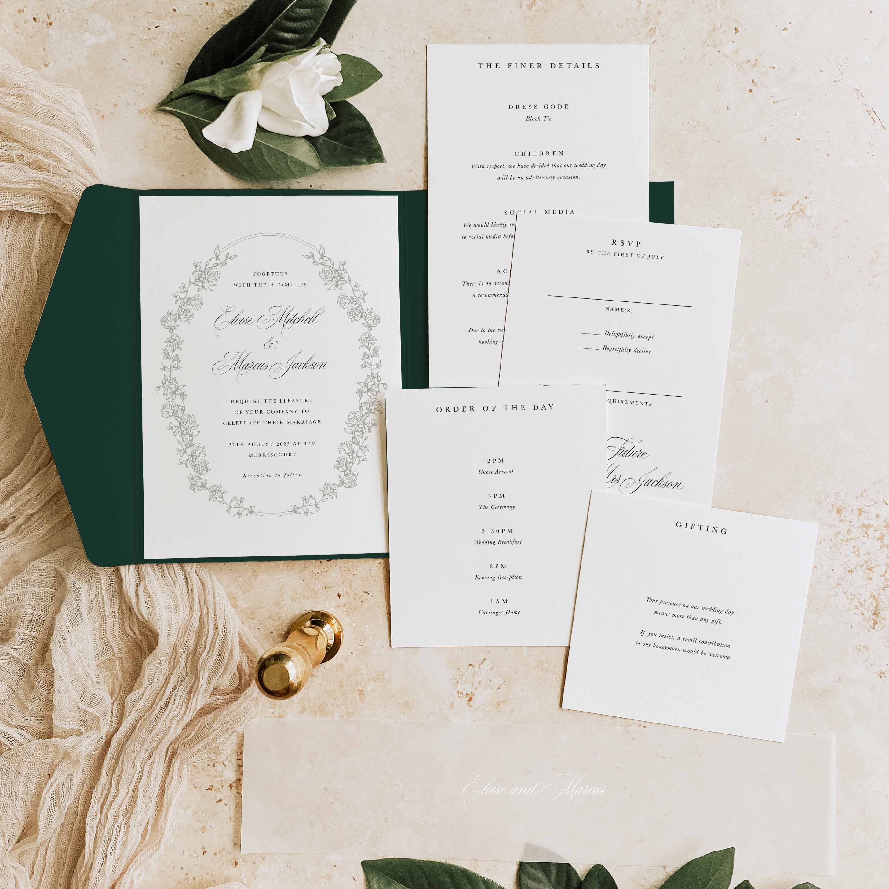 - Additional styling options available, such as belly bands, wax seals, coloured envelopes and liners, plus envelope addressing and guest name printing.