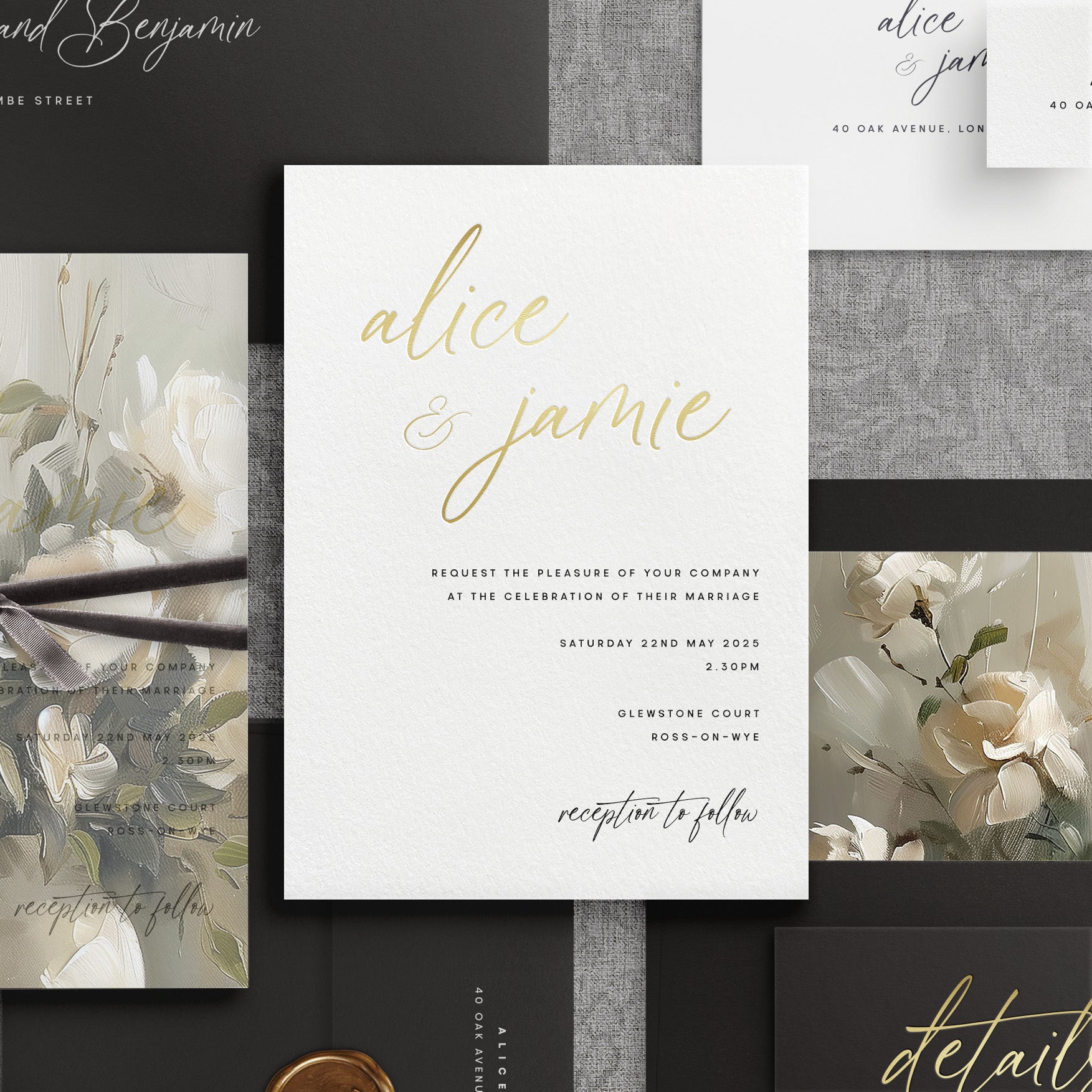 Simple but interesting and perfect for foil printing either partially or wholly, Alice is a great partner for a modern wedding day.