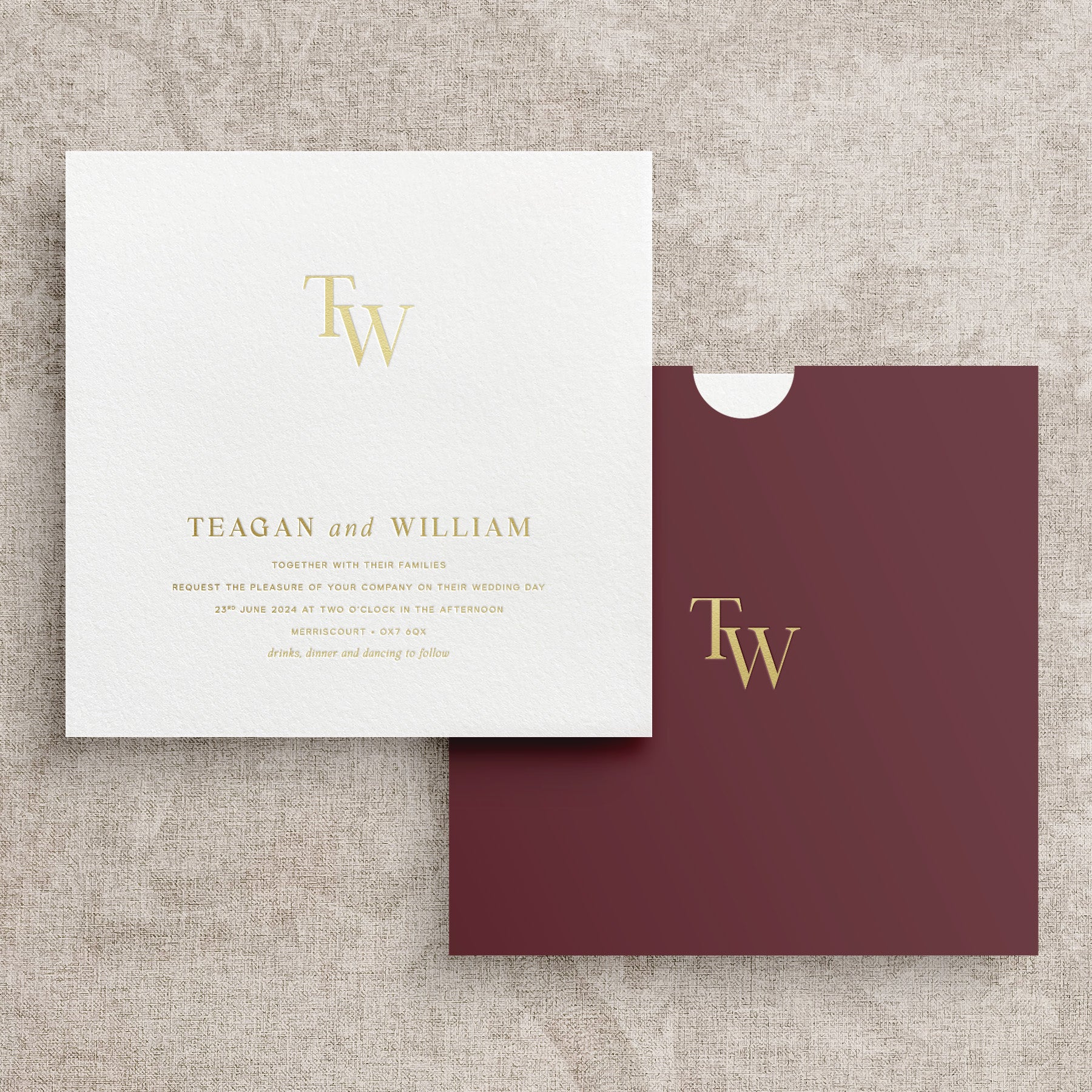This pictured example is our Hoxton collection - we've reformatted the invitation to be square and made a wallet / sleeve, with both items being foil pressed in gold.
