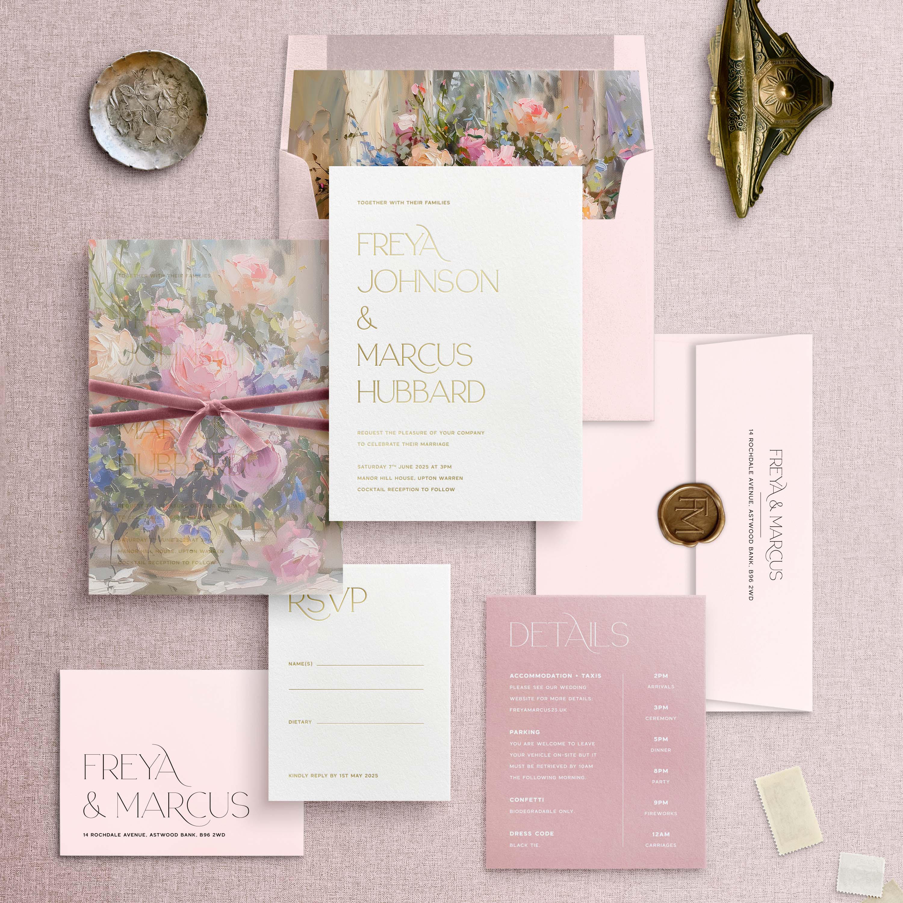 Shown in a beautifully feminine scheme, our Freya collection is a design that's beautiful for hot foiling.