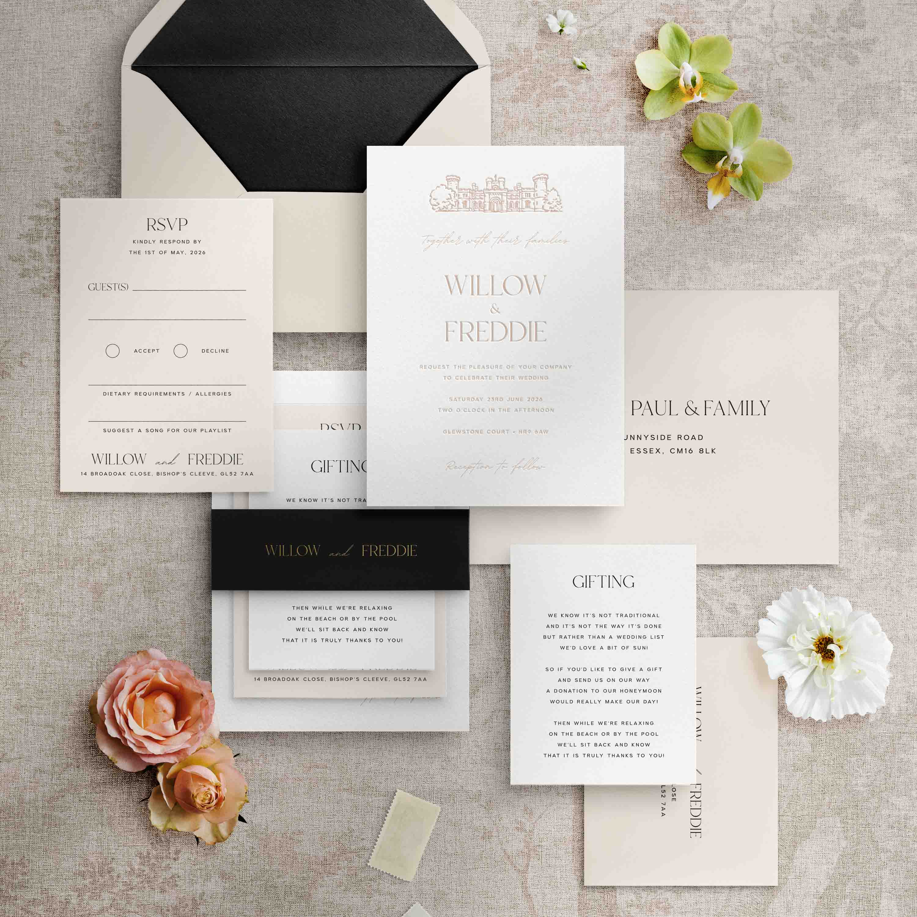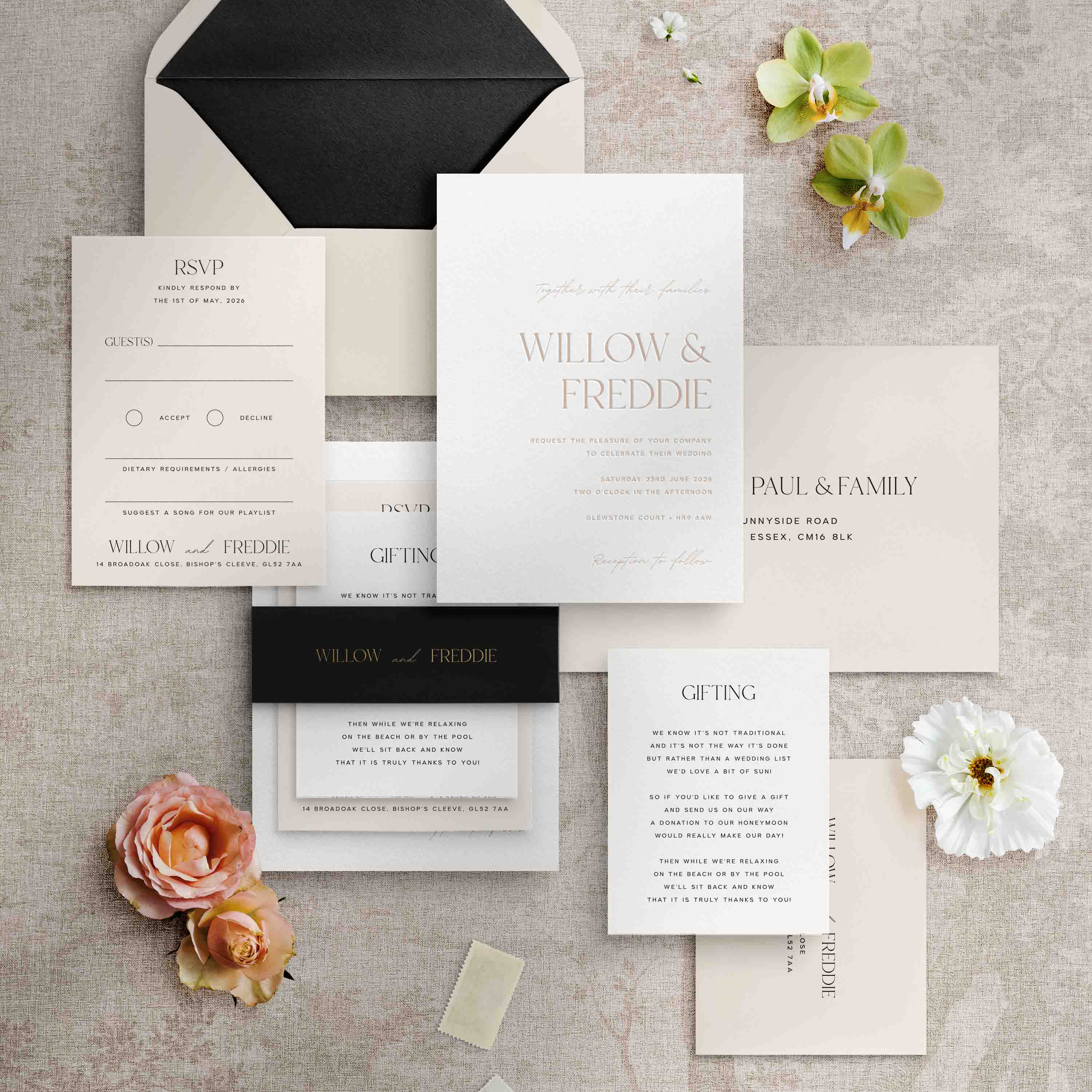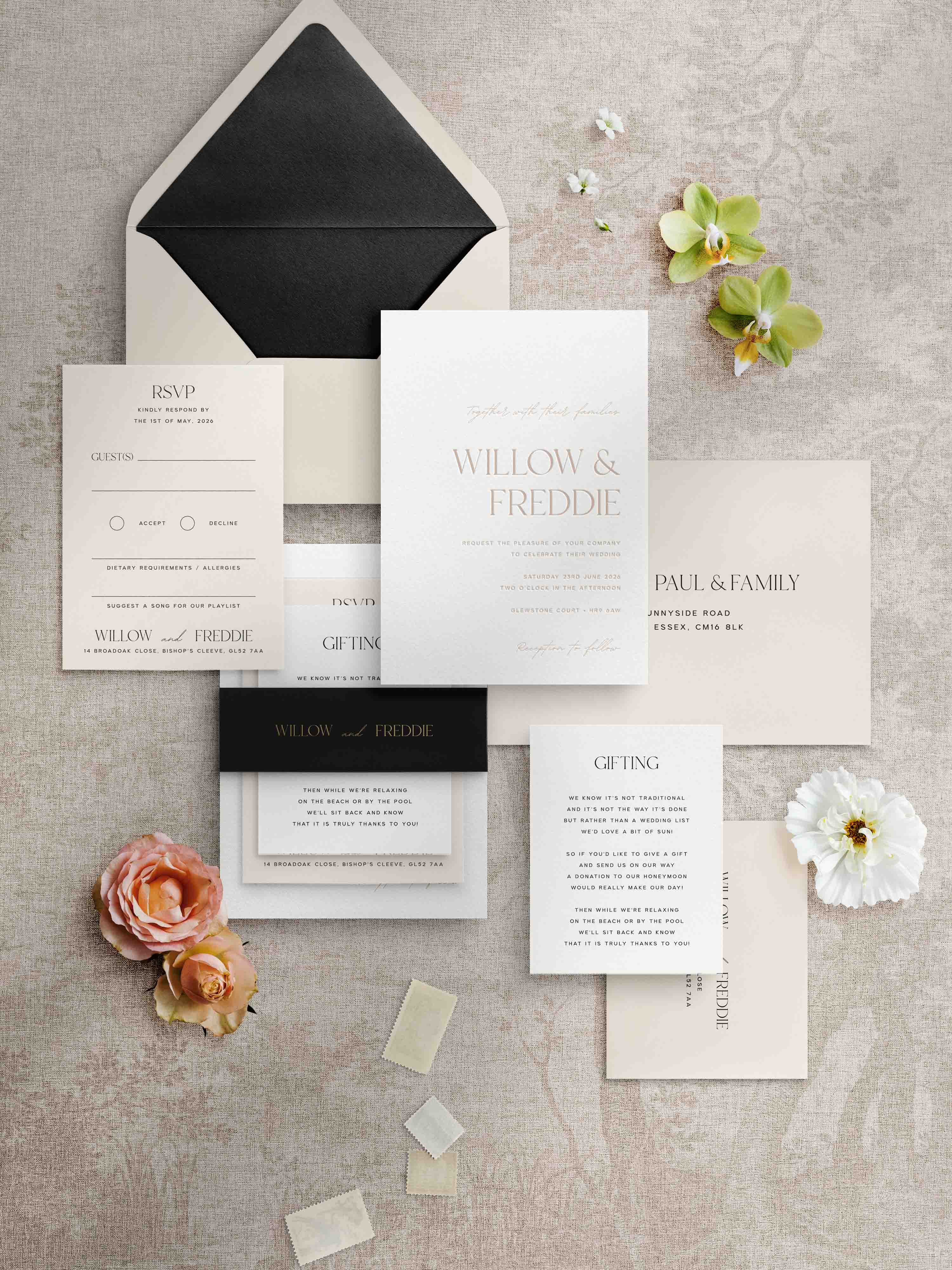 From classical and traditional to contemporary and understated, our collection of letterpress wedding invitations and stationery covers a mixture of tastes and styles. Each design is hugely customisable from styling and accessories to the wording you choose.